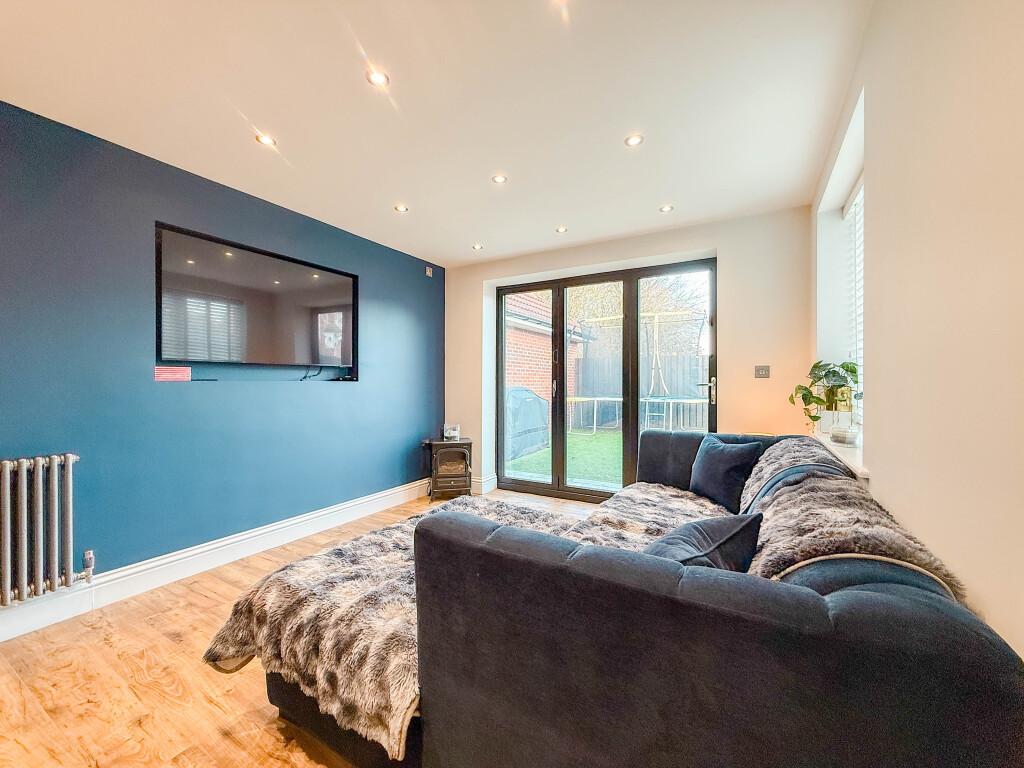 A separate lounge provides a cosy retreat, complete with a striking brick slip feature wall, inset fire, and bespoke cabinetry, adding both character and practicality.