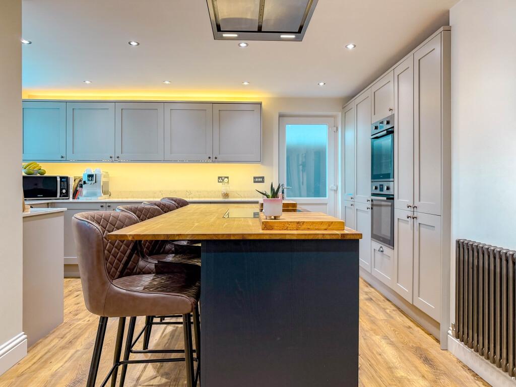 The ground floor is centred around a stunning open-plan family hub, designed for both entertaining and day-to-day living. The kitchen features stylish two-tone shaker units, a central island with integrated cooking facilities, and ample workspace, seamlessly flowing into a generous dining and sitting area. Bi-fold doors open directly onto the landscaped rear garden, creating a perfect indoor-outdoor living experience.
