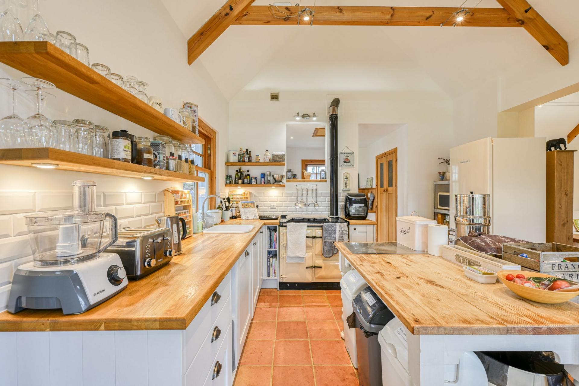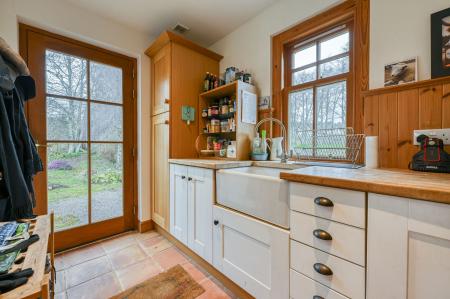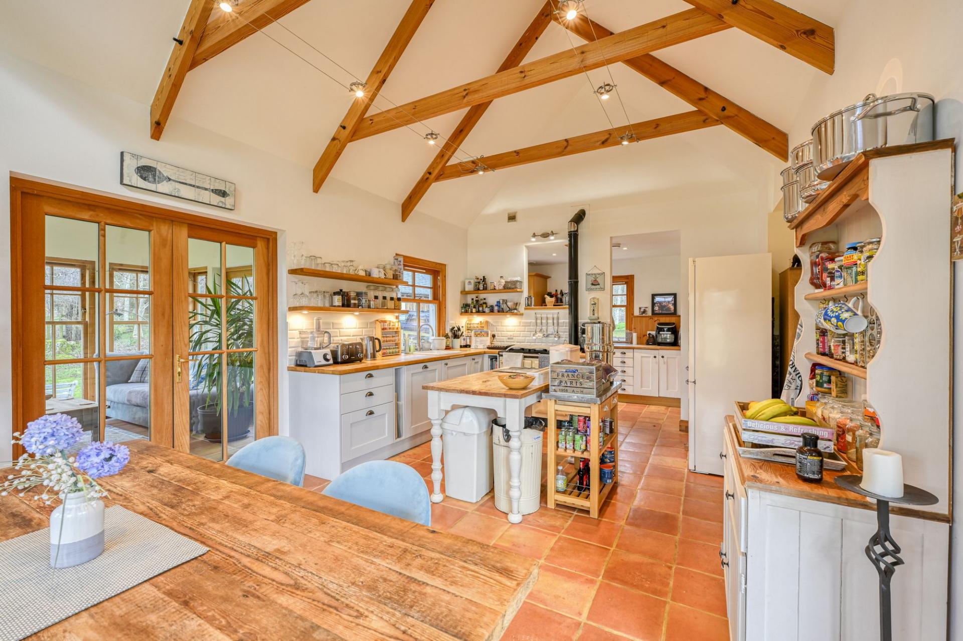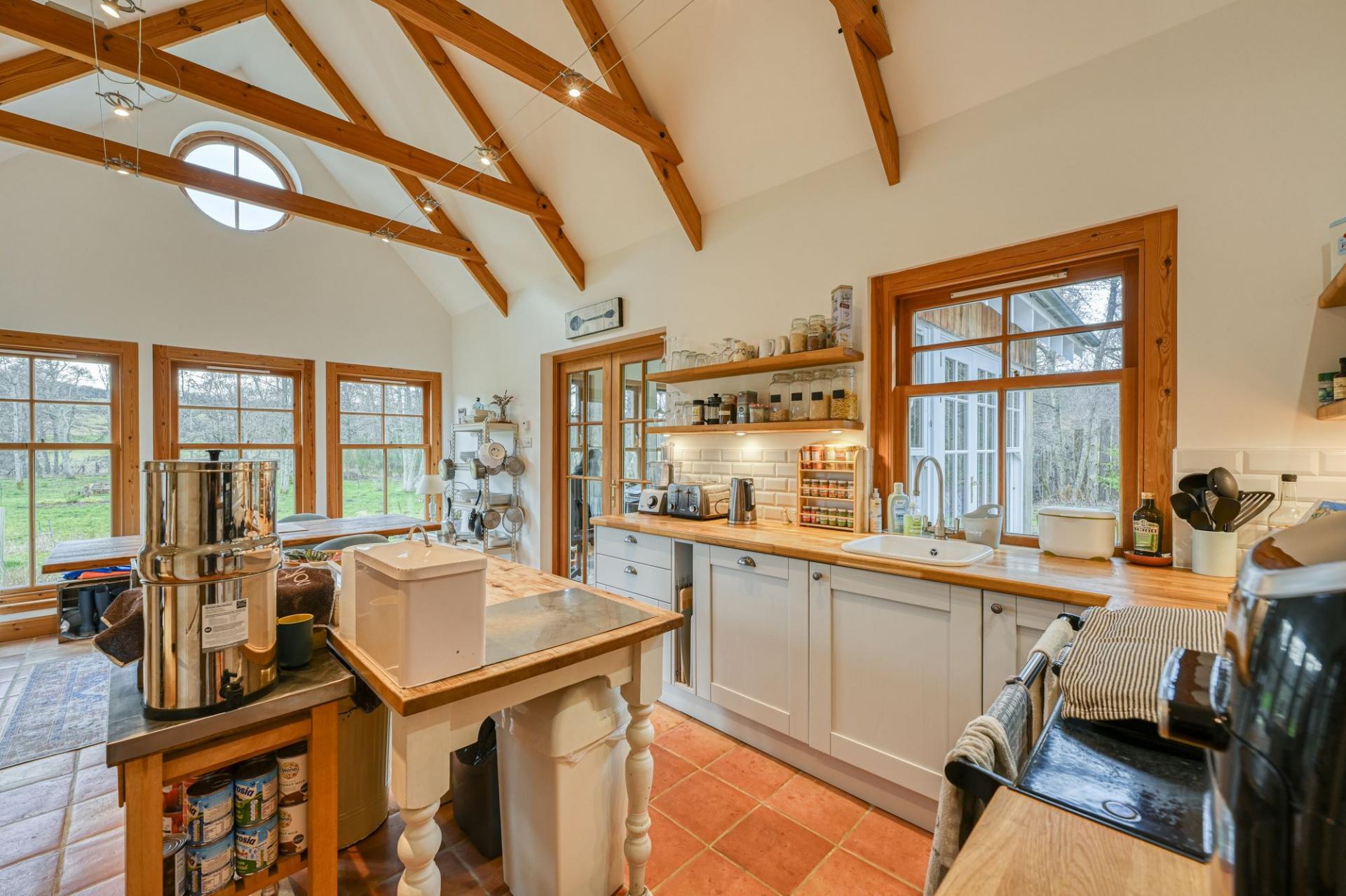 The kitchen is a true heart-of-the-home space, offering an excellent range of stylish units and generous work surfaces. At its centre sits a traditional Raeburn, which not only adds timeless country charm and a comforting ambient warmth, but also powers the home’s underfloor heating system, delivering consistent and efficient warmth throughout. This seamless blend of character and practicality perfectly complements the Highland setting.