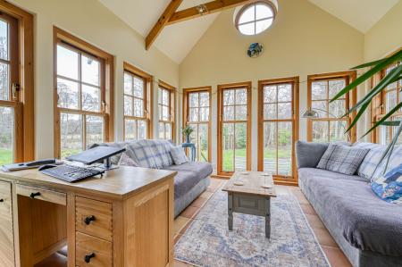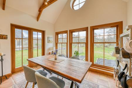 The open-plan dining area enjoys delightful views over the rear garden, with French doors opening directly onto the grounds - ideal for summer entertaining and seamless indoor-outdoor living. From here, step through to the garden room, a tranquil haven for morning coffee, evening drinks or a peaceful home-working space, again with French doors opening onto the garden and allowing the outside in.