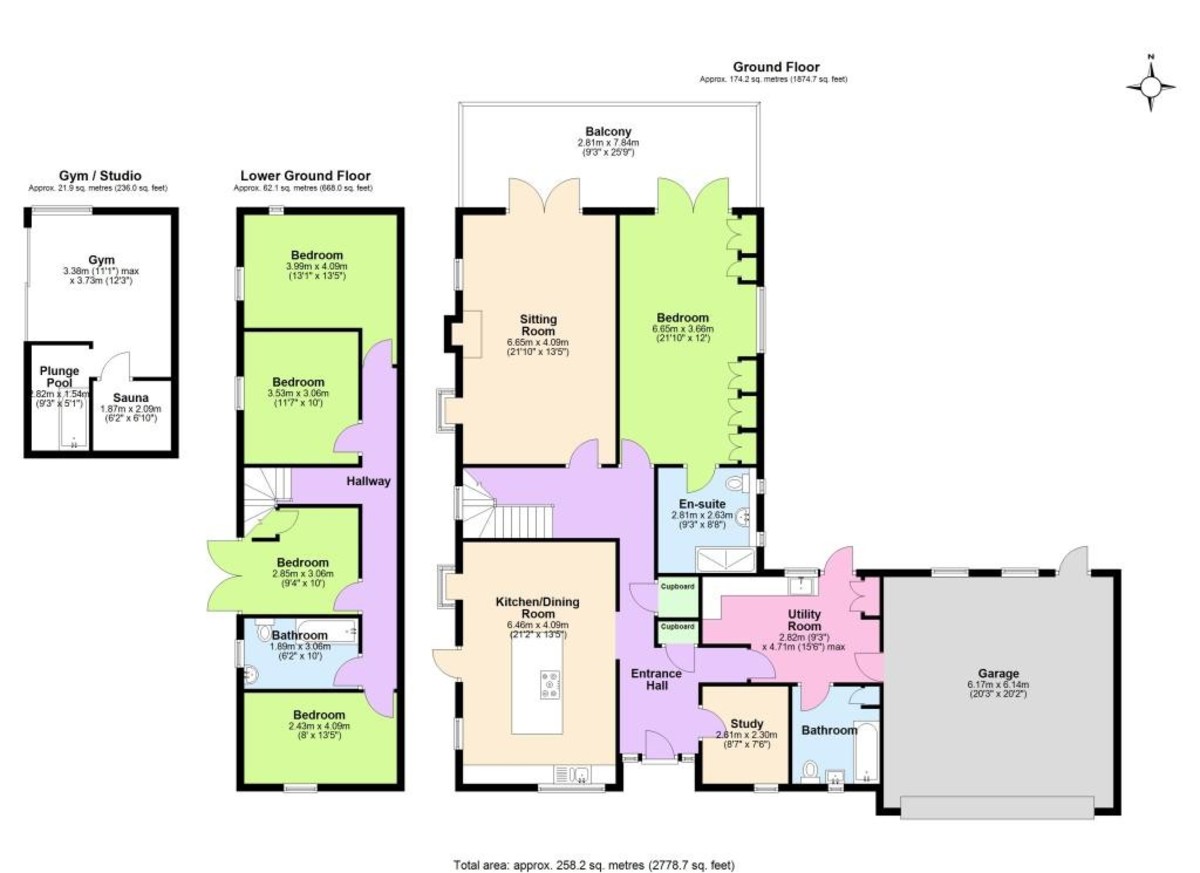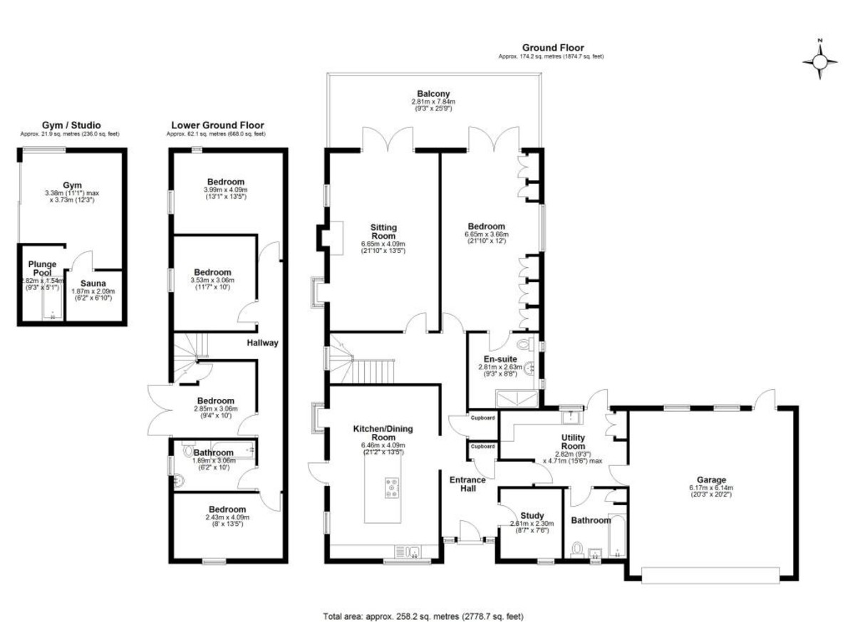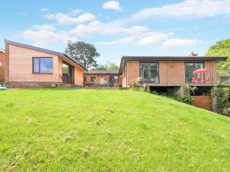 OUTSIDE Set back behind an impressive gated, winding private driveway, the property offers extensive frontage with ample parking and access to an attached double garage. To the rear, a beautifully established, expansive wraparound garden unfolds across sloping terrain and adjoining private woodland approaching 1.75 acres (STS), all enjoying sweeping panoramic views across the town. A generous courtyard-style entertaining terrace and an elevated, railed balcony connecting the principal bedroom and sitting room provide superb outdoor living spaces. Completing the arrangement is a stylish timber-clad outbuilding, perfect as a studio or gym, enhanced by its own sauna and shower room, delivering an exceptional touch of luxury.