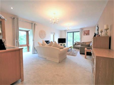 SITTING ROOM 21' 10" x 13' 5" approx. (6.65m x 4.09m) Double glazed window to side, double glazed boy bay to side, double glazed French doors to rear opening out to elevated and railed decking balcony terrace, two radiators, log burner set in fireplace recess, television point, insetLED ceiling lights.