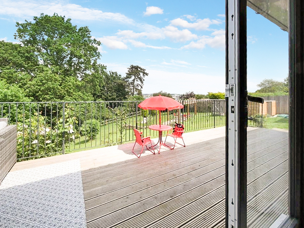 PRINCIPAL BEDROOM 21' 10" x 12' approx. (6.65m x 3.66m) Twin double glazed windows to side, double glazed French doors to rear opening out to elevated and railed decking balcony terrace, to radiators, built-in fitted double and triple wardrobes, inset LED ceiling lights, oak door to en-suite.