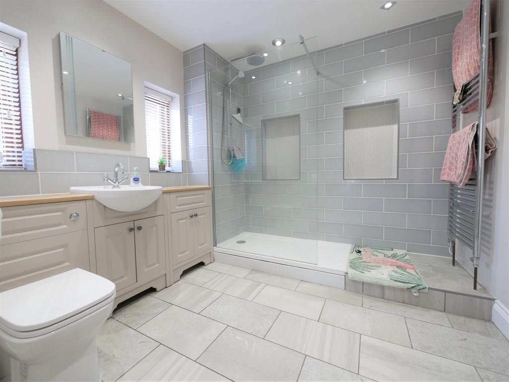 PRINCIPAL BEDROOM EN SUITE 9' 3" x 8' 8" approx. (2.82m x 2.64m) Twin obscured double glazed windows to side, under-floor heating, ladder style chrome heated towel rail, walk in double shower cubicle with glazed screen, twin recesses, thermostatic fixed head shower and separate rinser, mounted hand was-basin with mixer tap, wood effect side surfaces with cupboards under, low level WC with concealed cistern, metro style tiled splash backs, stone effect tiled floor, inset LED ceiling lights.