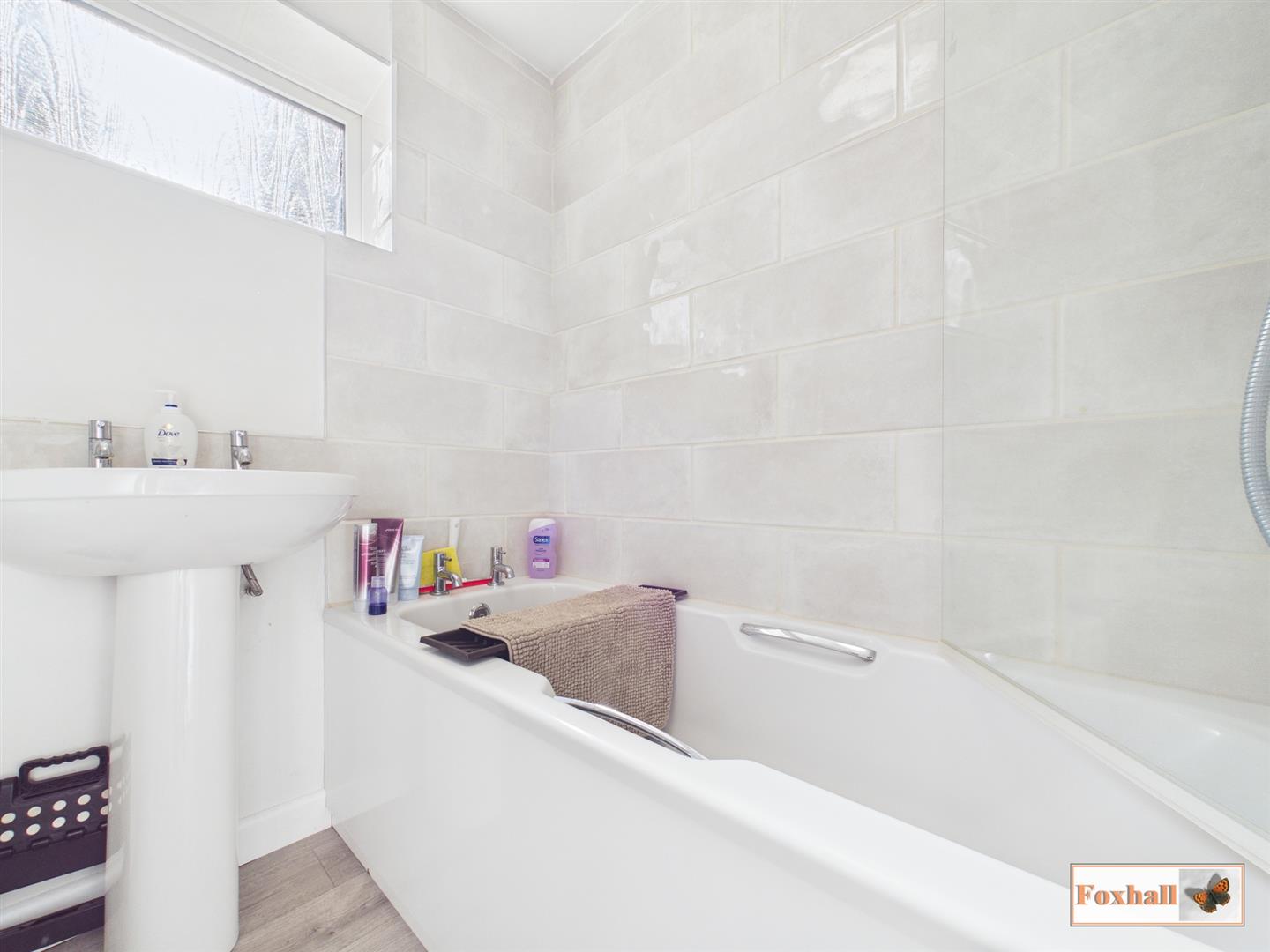 Bathroom - 2.16m x 1.68m (7'1" x 5'6") - Panel bath with stainless steel taps and shower with tiled splash-backs and glass shower screen, pedestal hand wash basin, low-level W.C., radiator, side aspect frosted double glazed window and laminate flooring.