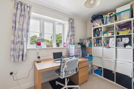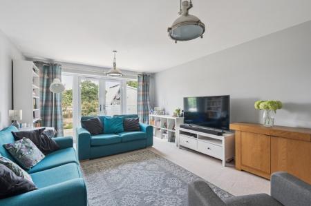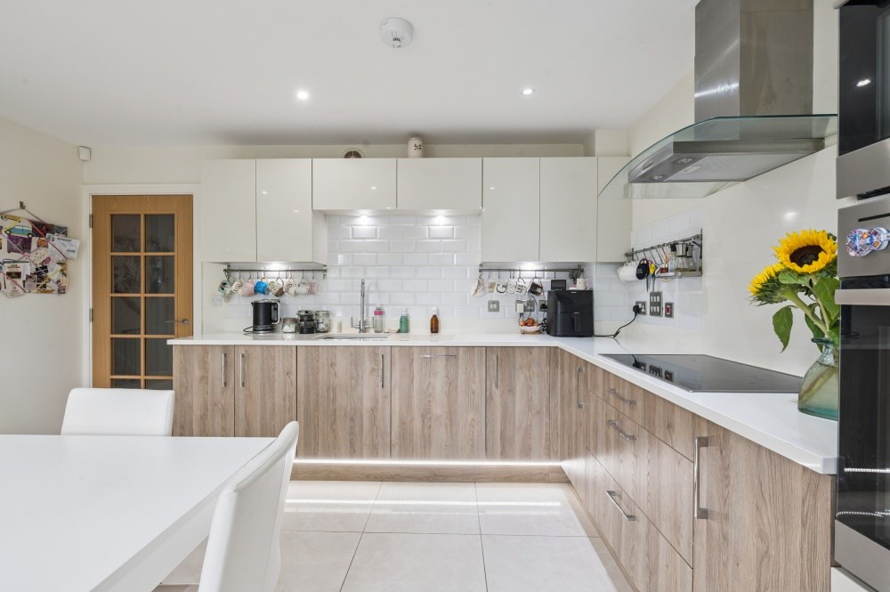 At the heart of the home is a contemporary kitchen/breakfast room, fitted with integrated appliances, ample storage, and space for a family dining table. French doors lead out to the beautifully landscaped garden, creating a natural flow between indoor and outdoor living. A downstairs W/C, and integral garage (with power) enhance everyday practicality.