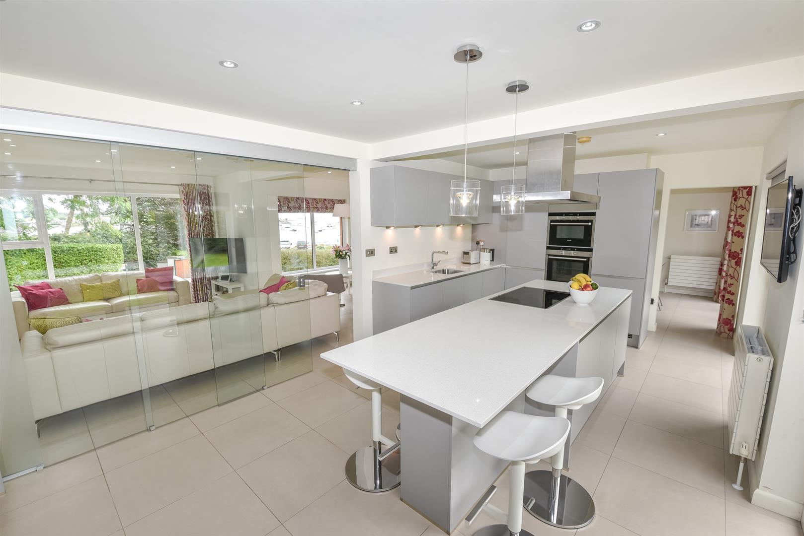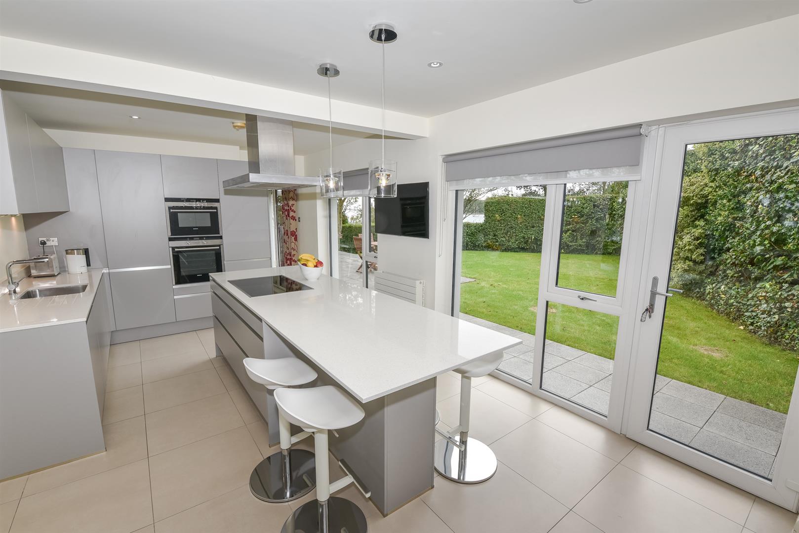 Modern Fitted Kitchen: - (6.96m x 3.53m) - Excellent range of high and low level units, quartz sinquastone work surface with stainless steel inset sink unit and drainer with mixer tap, integrated double Siemens oven, integrated fridge freezer, integrated dishwasher, larder cupboard, plumbed for washing machine, space for tumble dryer, island unit with quartz sinquastone work surface, four ring Siemens induction hob, ample storage, breakfast bar area, outlook to rear with fantastic views over Strangford Lough and further afield, sliding glass doors leading through to living room.