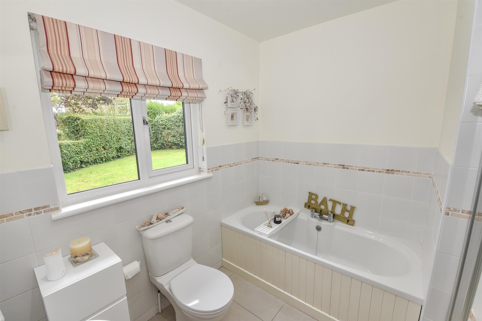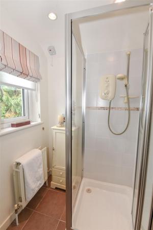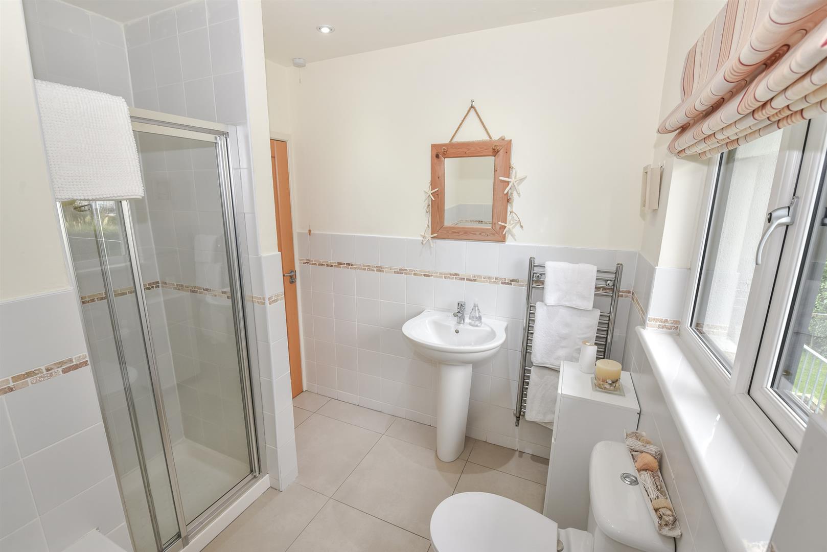 Bathroom: - () - White suite comprising of low flush WC, full pedestal wash hand basin with mixer tap, walk-in shower with electric shower unit, wood panelled bath with hot and cold mixer tap, partly tiled walls, tiled flooring, recessed spotlighting, extractor fan, fantastic views over Whiterock Bay.