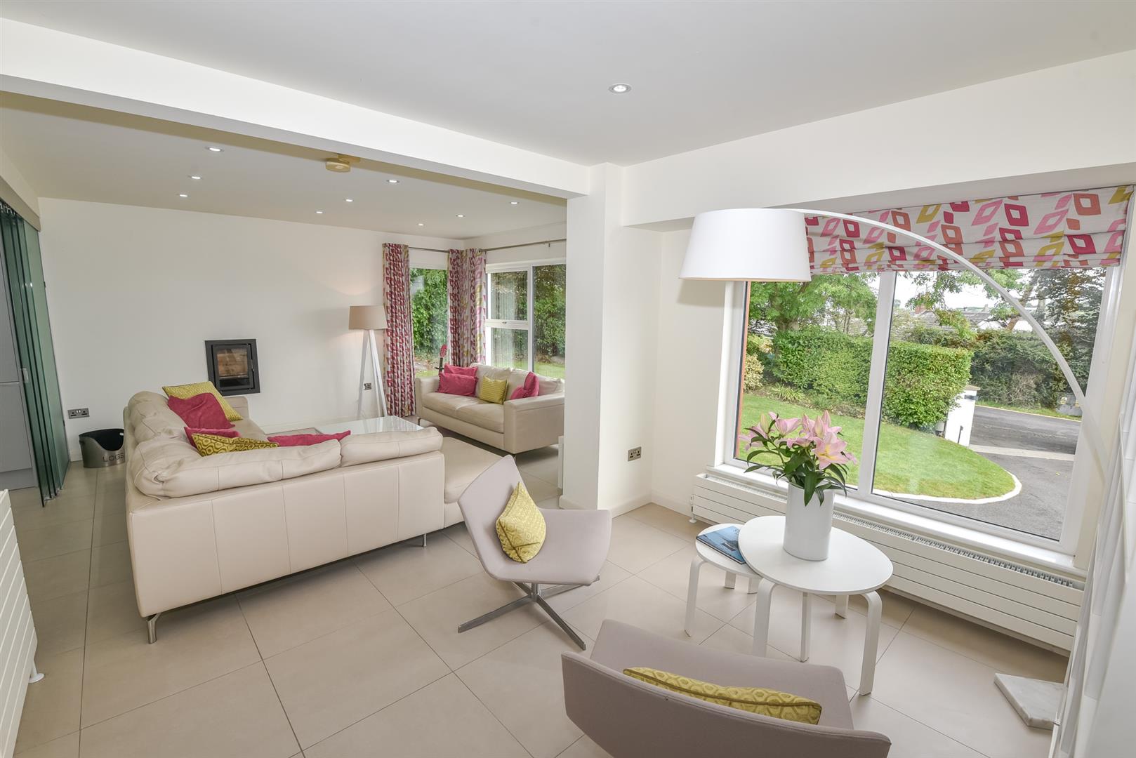 Living Room: - (6.96m x 4.37m) - Ceramic tiled flooring, recessed spotlighting, inset multi fuel burning stove, spectacular views over Whiterock Bay and further afield, sliding glass doors leading through to kitchen.
