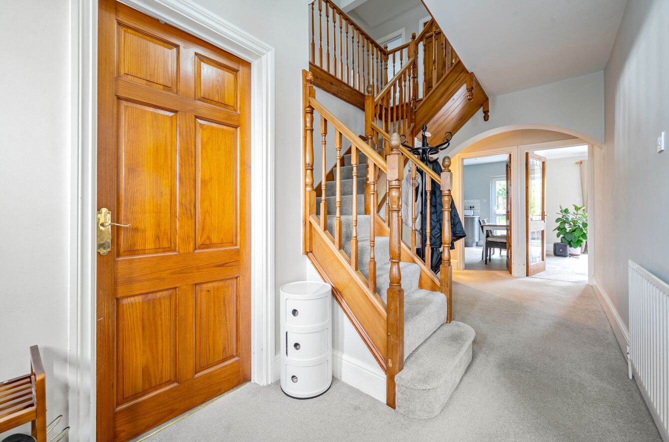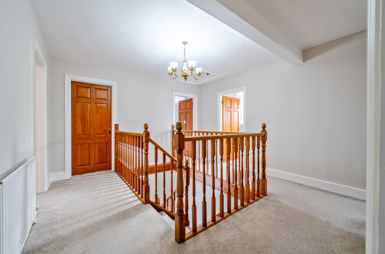 From the hallway, the dog-leg staircase leads up to the first floor and an impressive galleried landing. From here there are four double bedrooms and one single bedroom. The master, overlooking the rear garden, benefits from a large four piece ensuite bathroom. Bedroom two, also looking over the rear garden, has an ensuite shower room and built-in storage cupboard. Bedrooms three and four are generous sized doubles with built-in wardrobes. Bedroom five, along with a large family bathroom plus an airing cupboard, complete the accommodation on this