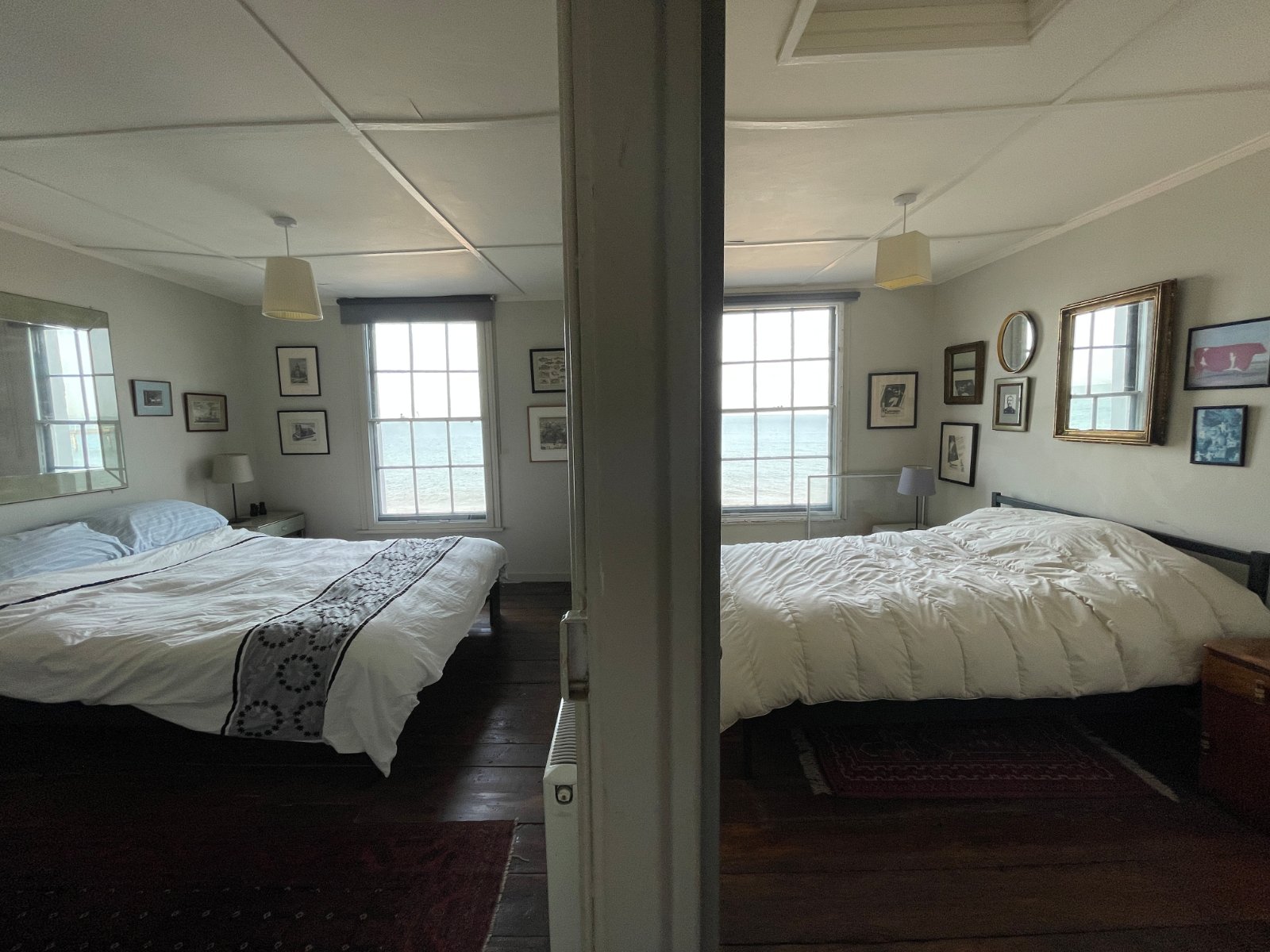 room. This double aspect room with direct sea views from each window, has exposed floors, panelled walls and a feature fireplace. Additionally, the first floor offers a double bedroom and bathroom.