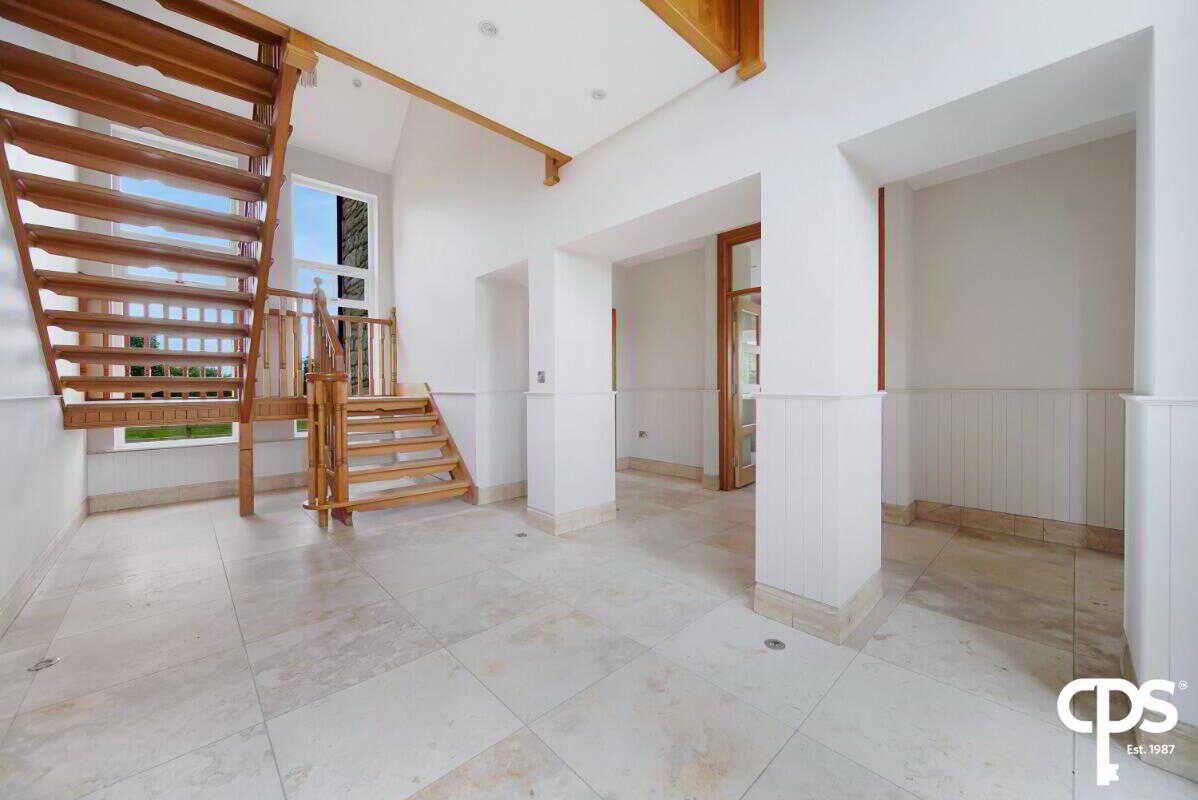 The entrance hall is accessed through a PVC door with a double glazed inset and a glazed surround; which allows the natural light to enter and create this bright and spacious entrance. This space features two structural columns, wooden wall panelling, spot lighting, and floor lighting. The security alarm panel is located at the front door and access to the beautiful open oak staircase.