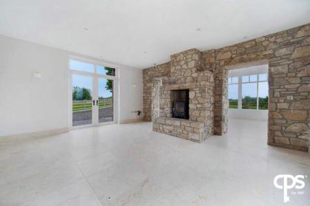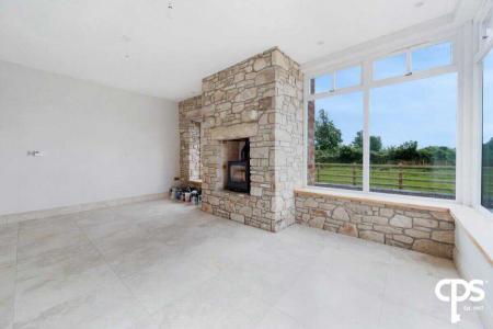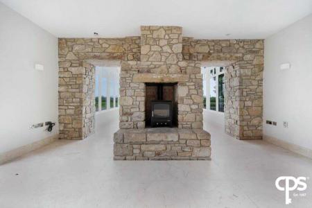 Next to the kitchen and dining room is the second reception room; which also features a beautiful stone wall and chimney breast with an open fire. The tiled flooring and skirting continue through this room; as well as a stunning corner window. spot lighting, and glazed French doors.