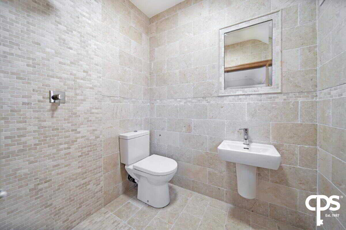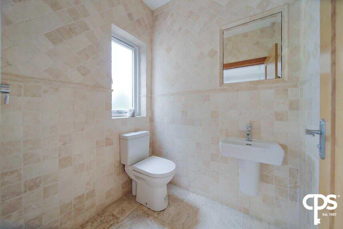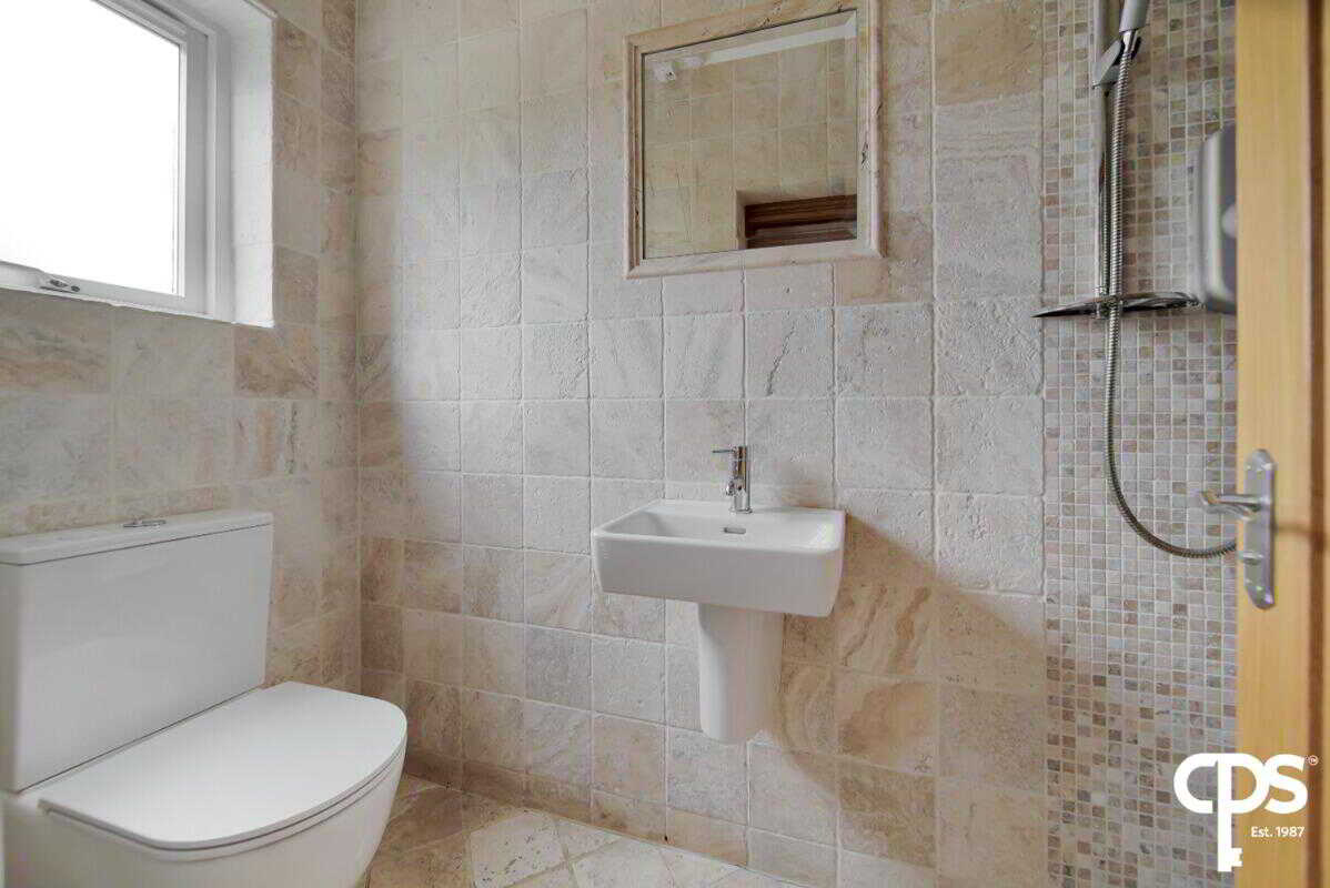 Off the fourth bedroom; this ensuite shower room is fully tiled with a wash hand basin, WC, enclosed walk-in shower, a fitted feature mirror, spot lighting, and a small wooden frame double glazed window.
