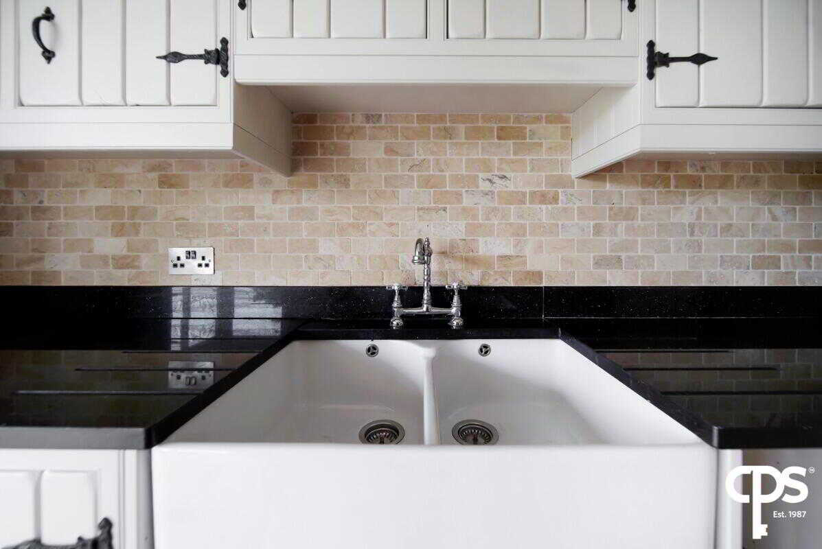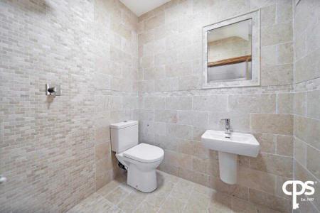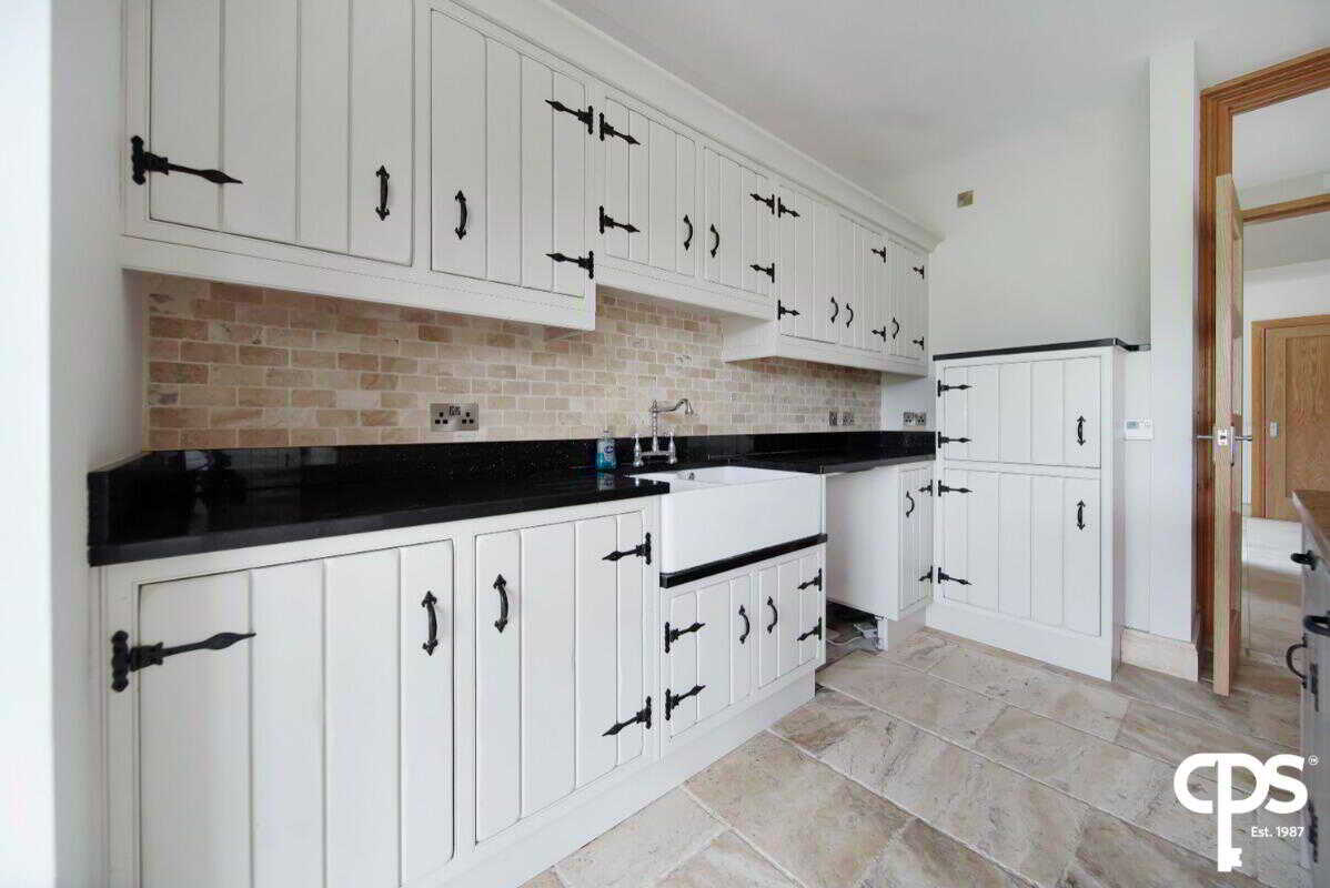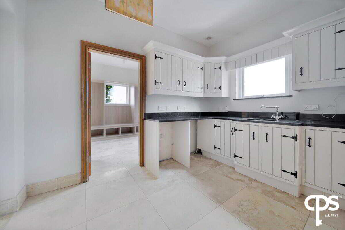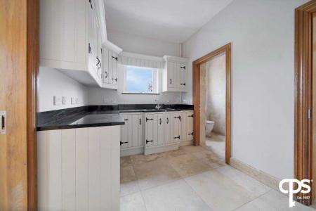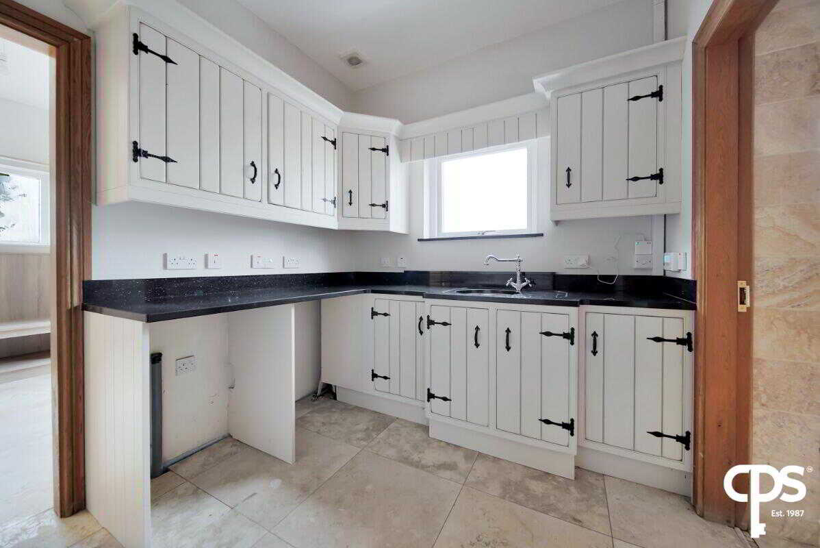 The utility room shares the same country style high- and low-level units as the kitchen with a black granite worktop with a drainer and sink. This rooms offers an entrance and exit PVC door to the enclosed patio area; as well as a tiled flooring and skirting, wooden frame double glazed window, extractor fan, access to an attic, and houses the electric switch board.
