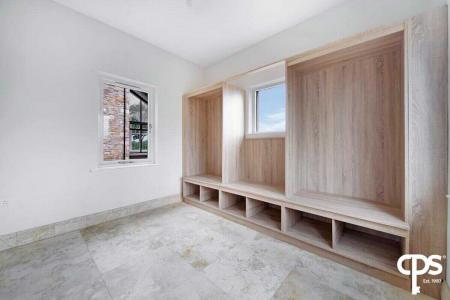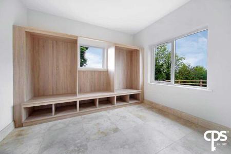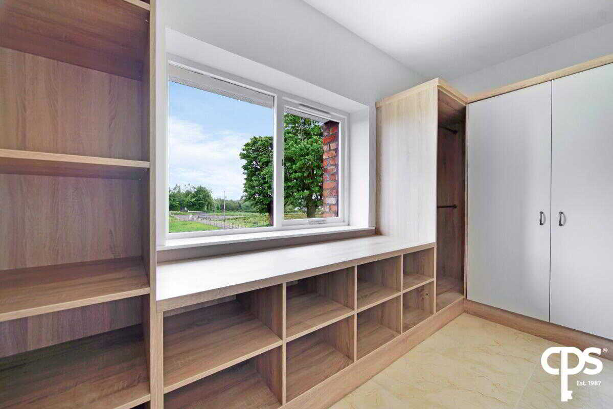 Ideal for all those clothes and shoes; this great dressing room offers various shelving and cupboard space with tiled flooring and a wooden frame double glazed window.