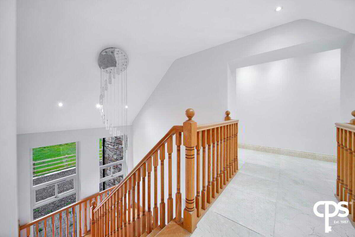 Accessed off the main entrance hall this stunning open oak staircase leads to the first floor. The landing has tiled flooring and spot lighting; while featuring an atrium style opening with a stunning chandelier light fitting.