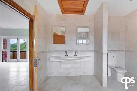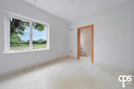 Off the master bedroom; this ensuite bathroom is fully tiled with a his and hers wash hand basin, WC, walk-in shower, space for a bath, a fitted feature mirror, extractor fan, spot lighting, and a wooden frame double glazed window.