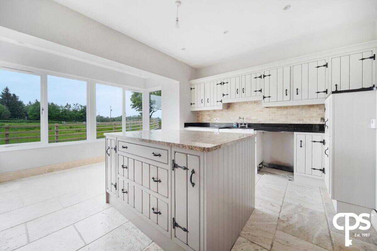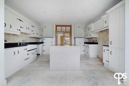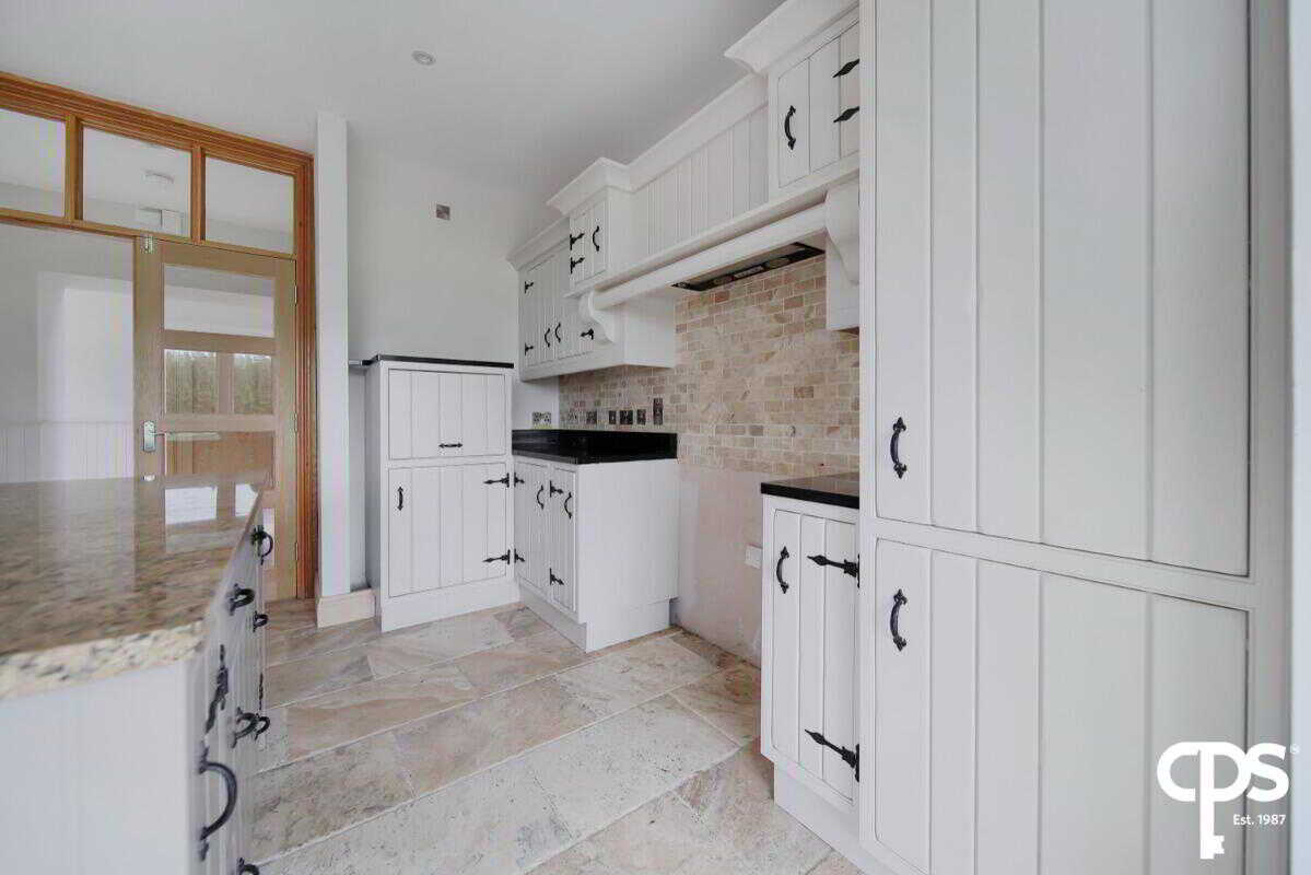 Just off the entrance hall through another set of glazed French doors; this fully fitted country style kitchen and dining room offers a beautiful space for family living. The kitchen has ample storage with high- and low-level units, a black granite worktop, a feature island, a double Belfast sink, and space for a range stove. The dining area benefits from fully glazed windows; bringing in ample natural light.