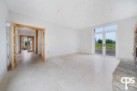 Leading off the entrance hall through glazed French doors; this reception room features the same tile flooring through the ground floor and tiled skirting. A stunning addition to this room is a beautiful stone wall and chimney breast with an open fire, as well as feature spot and wall lighting. This room has a large wooden frame glazed window and PVC patio doors.