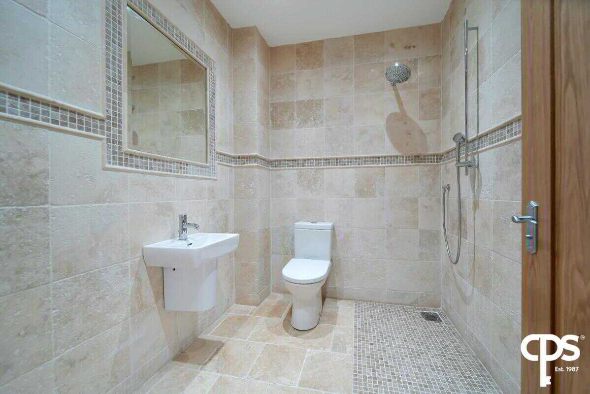 Off the first bedroom; this ensuite shower room is fully tiled with a wash hand basin, WC, enclosed walk-in shower, a fitted feature mirror, and spot lighting.