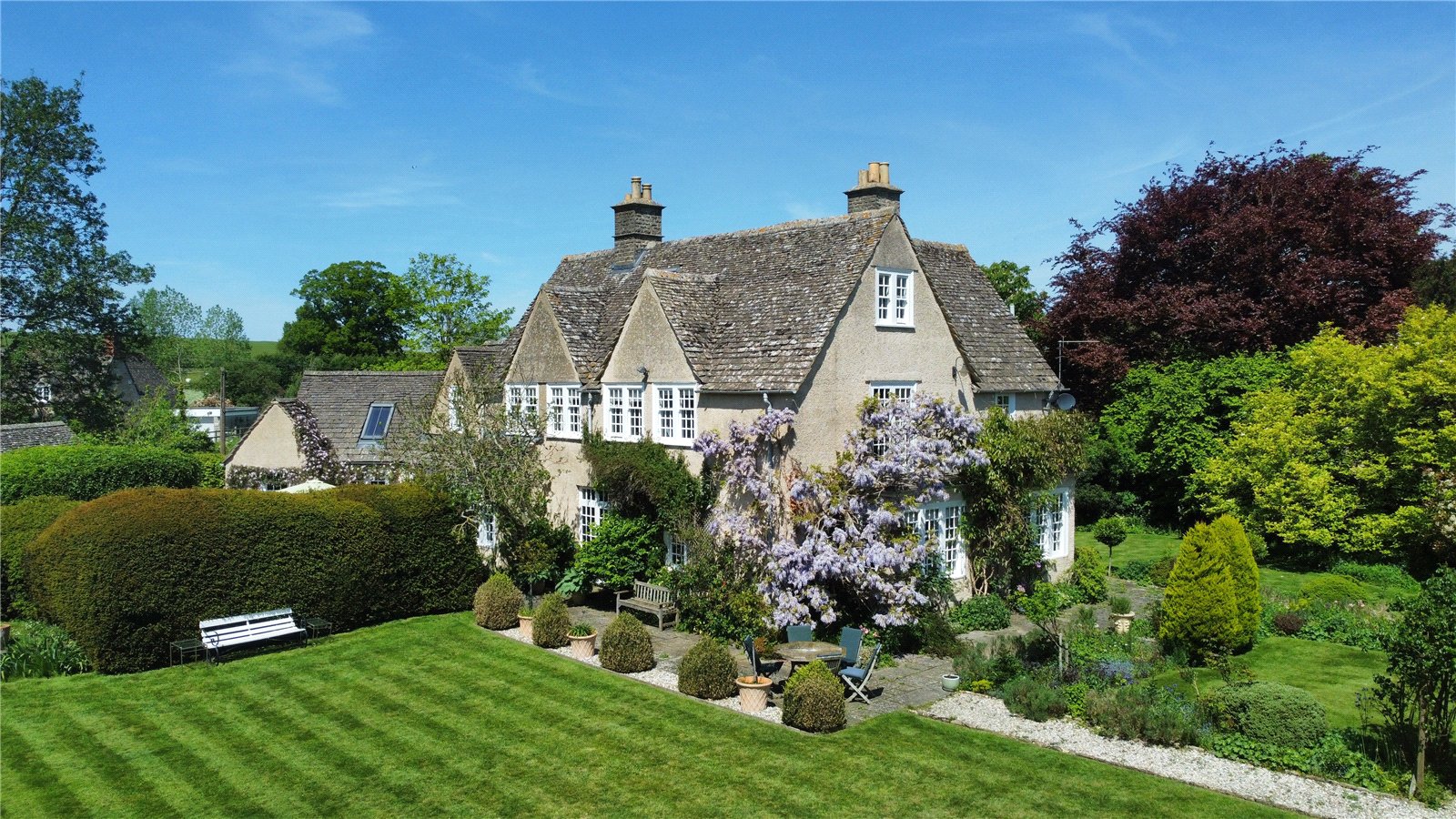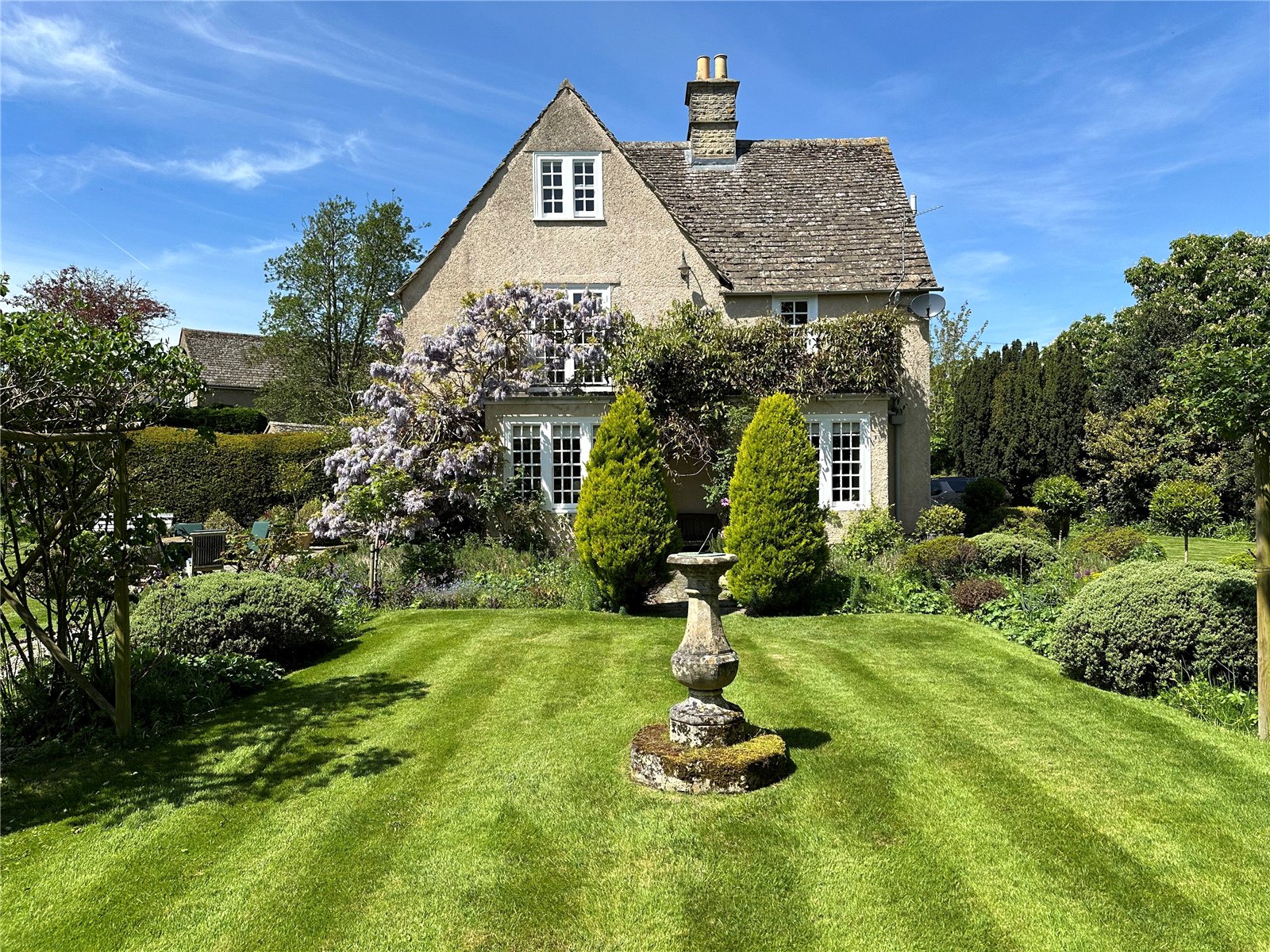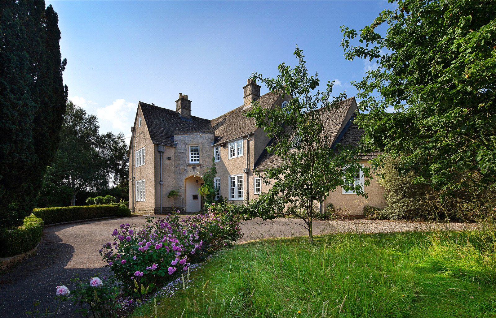 The property is set within beautifully landscaped gardens, originally designed by renowned architect Charles Ashbee and carefully preserved in their original style. A semi-circular driveway provides dual access points and offers ample parking.