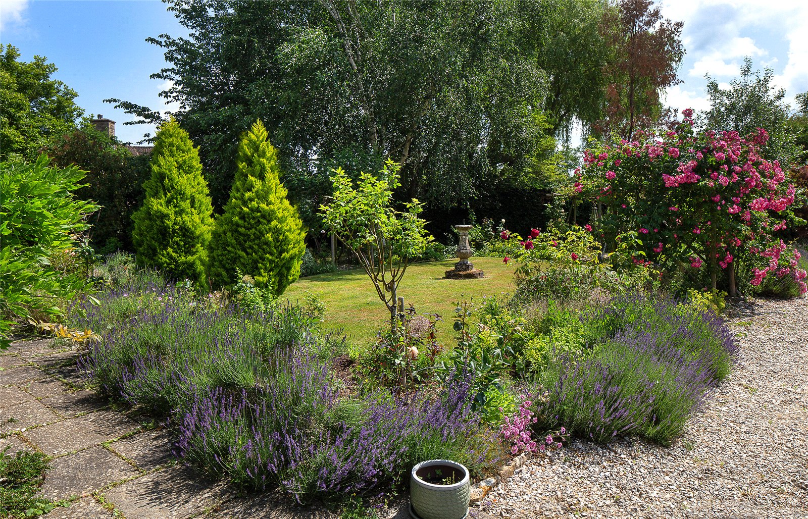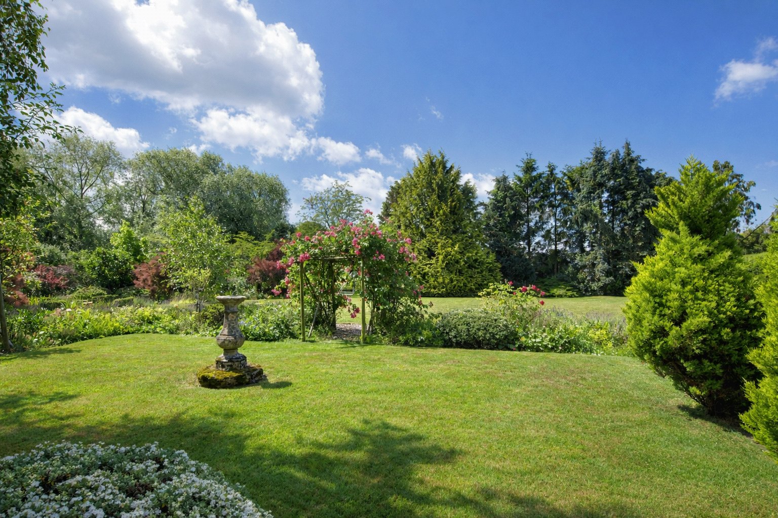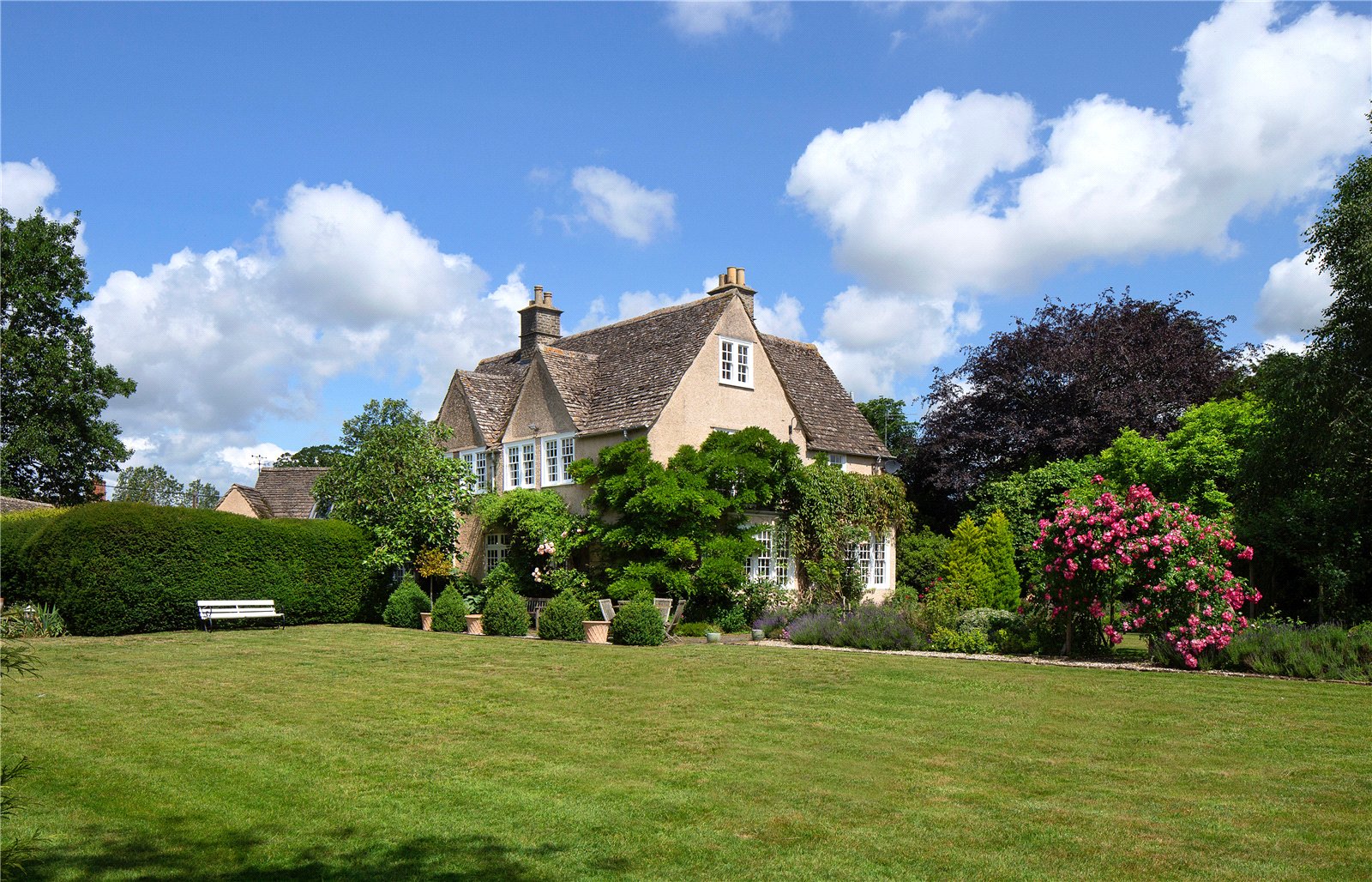 The property is set within beautifully landscaped gardens, originally designed by renowned architect Charles Ashbee and carefully preserved in their original style. A semi-circular driveway provides dual access points and offers ample parking.