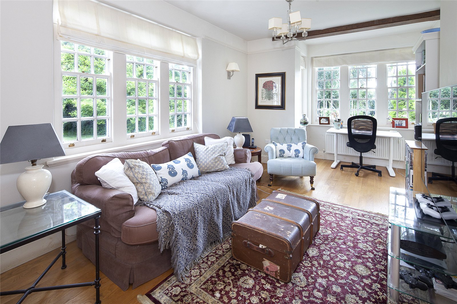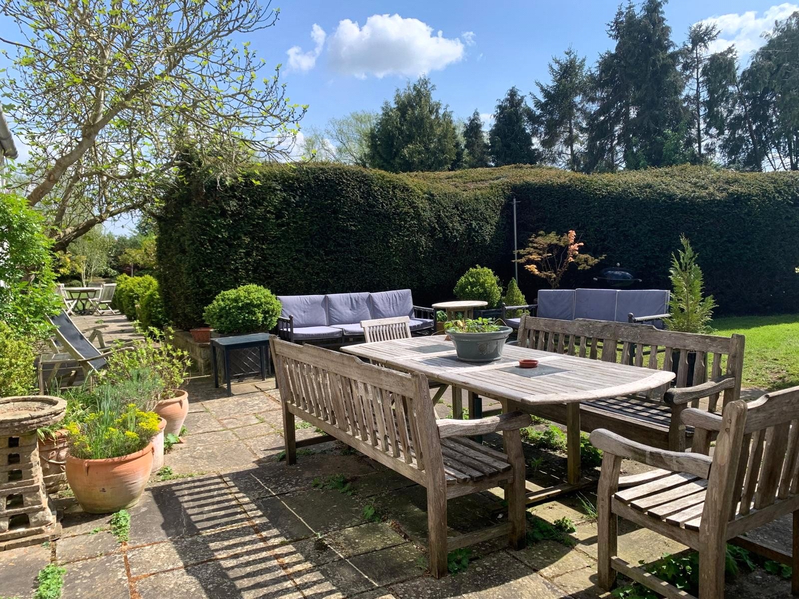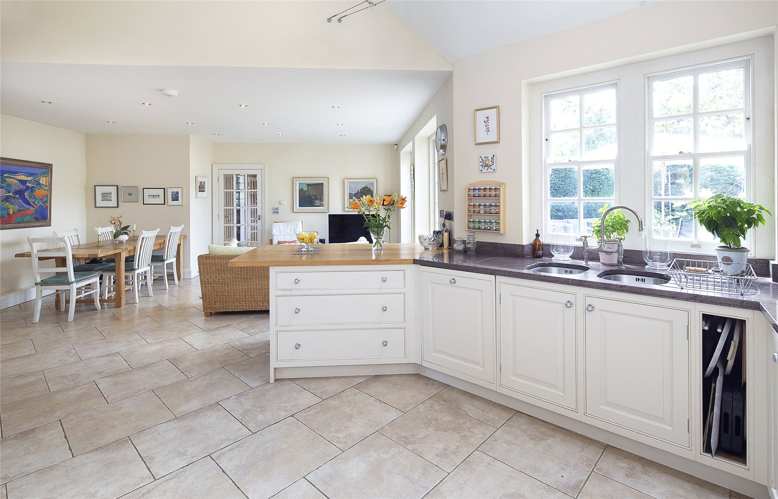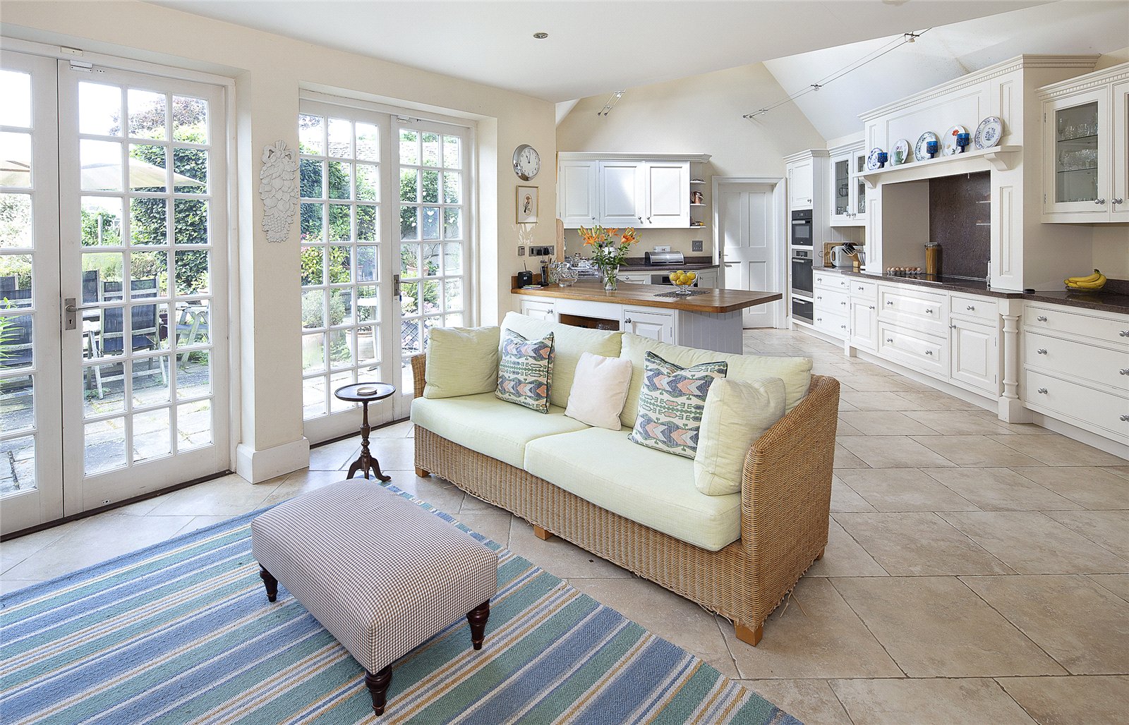 The recent extension adds a superb breakfast/sitting room and a spacious kitchen, complete with vaulted ceilings, Miele appliances, underfloor heating, and double French doors opening to a private terrace, perfect for relaxed dining or family gatherings.