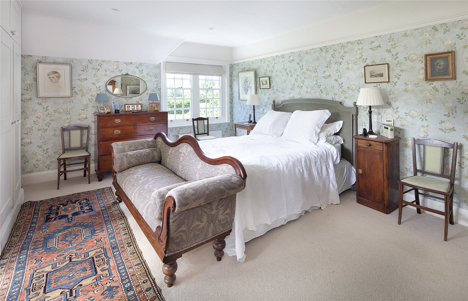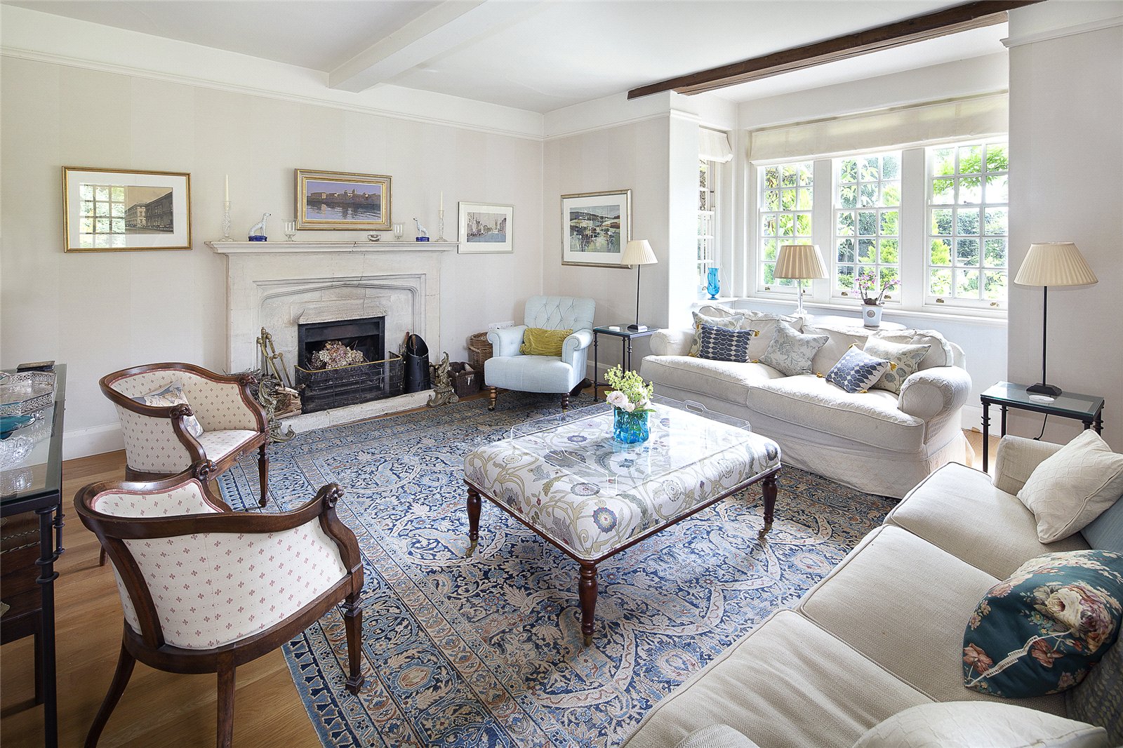 Upstairs, the first floor offers five bedrooms and a family bathroom. The principal bedroom is generously sized at approximately 256 sq ft and benefits from a spacious en suite and a balcony overlooking the manicured gardens.