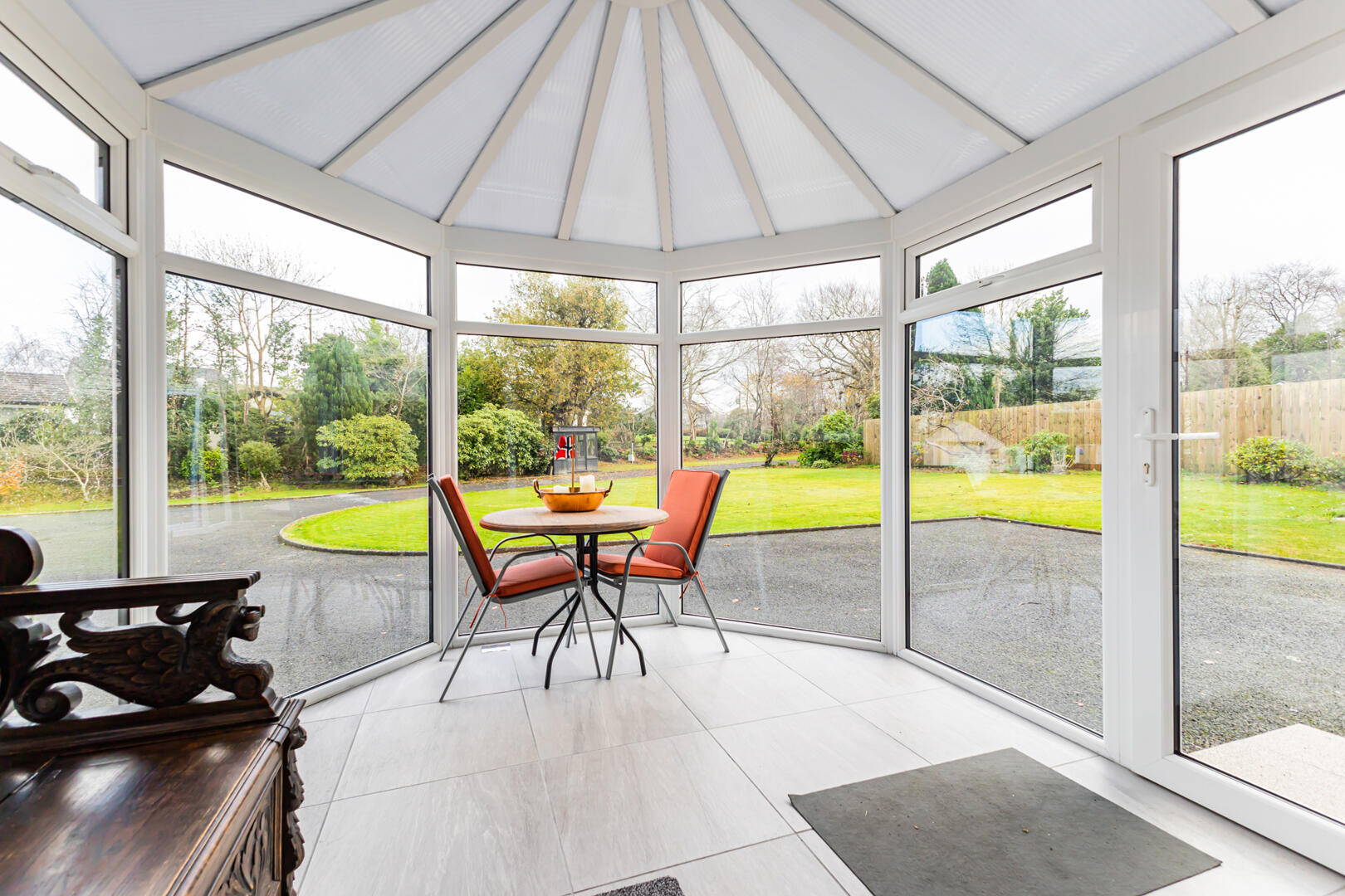 Family Lounge - 5.97m x 3.05m (19'7" x 10') - bay window to front with mature outlook, porcelain tiled floor, cornice ceiling, wood-burning stove on polished granite hearth, double doors to sitting area