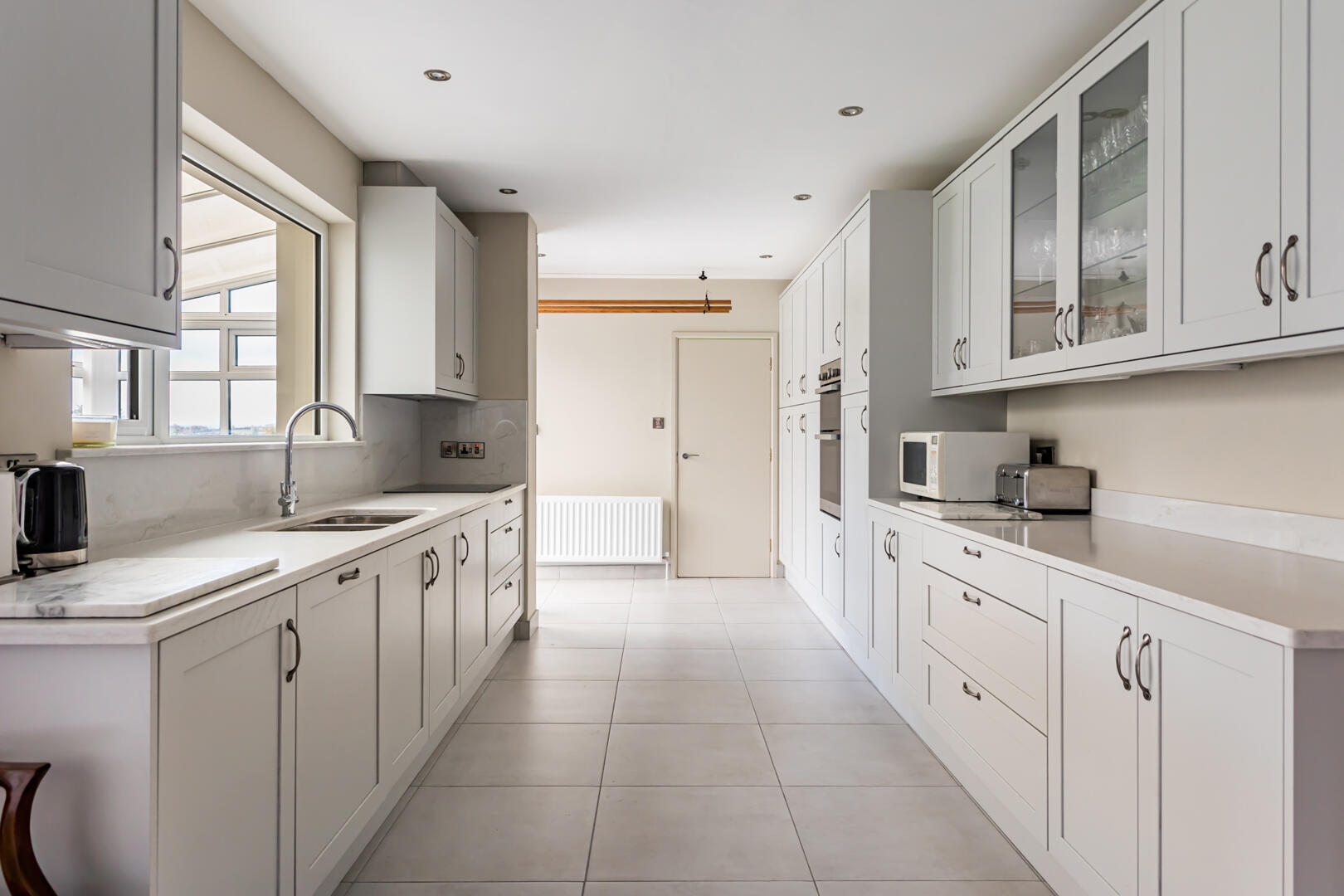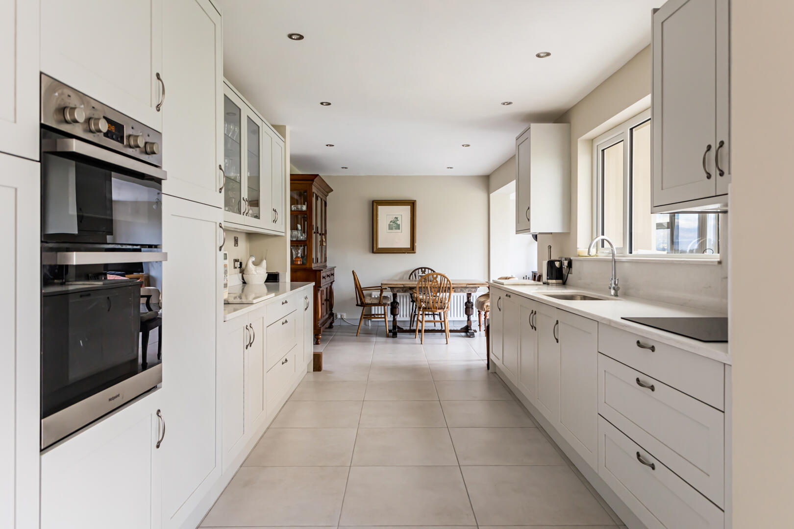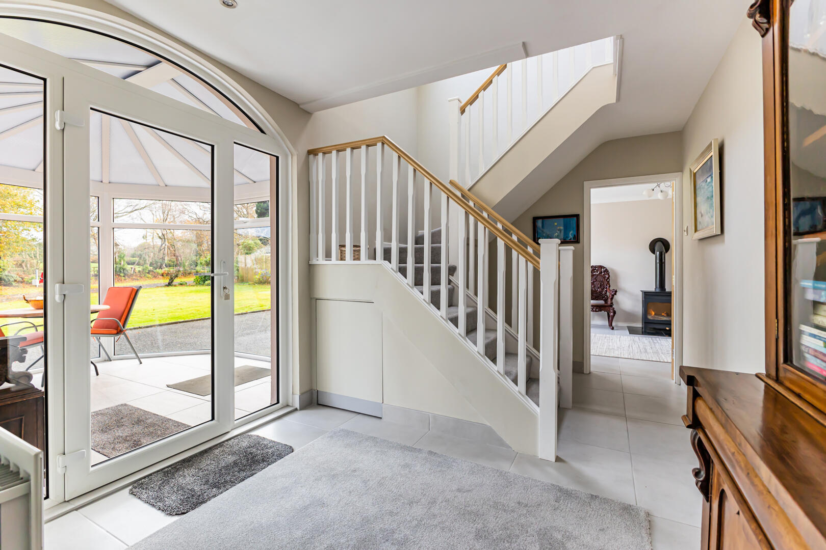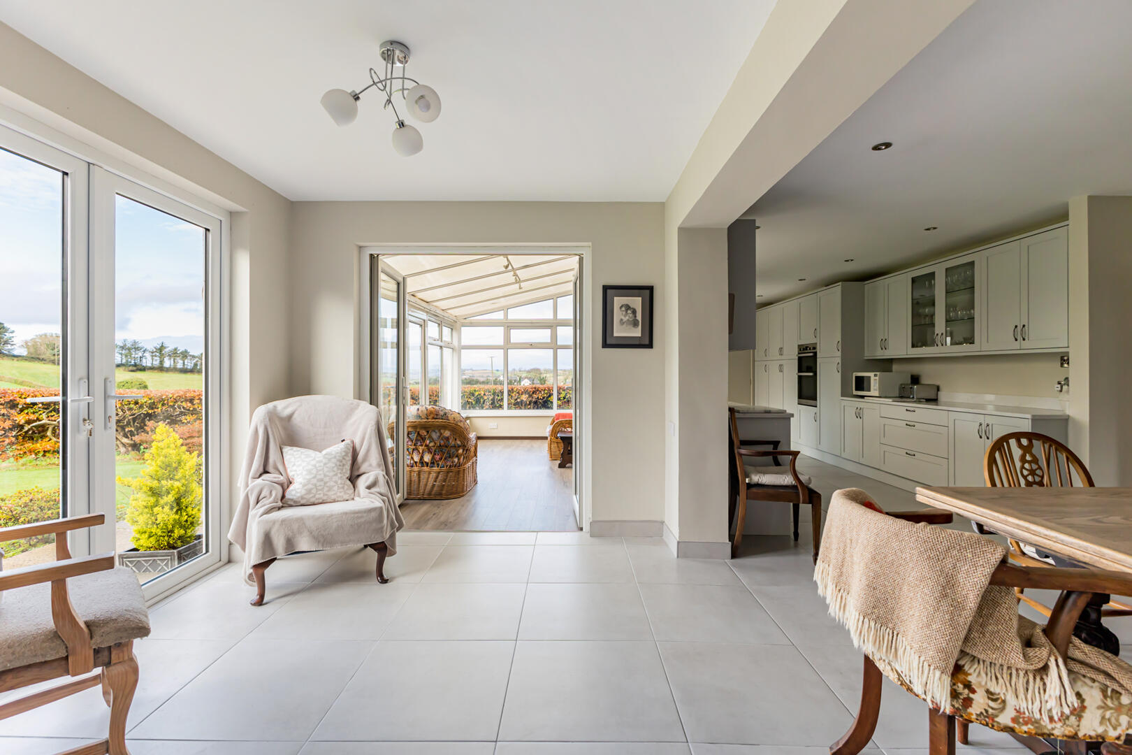 Kitchen/Living/Dining - 2.90m x 8.92m (9'6" x 29'3") - porcelain tiled floor, quartz worktop and splashback, recessed spotlights, range of low and high-level units, solid wood doors, quartz worktops, glass display cabinets with lights, integrated dishwasher, SMEG 1 ? bowl stainless steel sink with chrome mixer tap, 4-ring induction hob with extractor fan, integrated fridge, Hotpoint integrated double oven and grill, larder fridge, deep insulated floor, UPVC doors to sunroom, multi-burner stove on granite hearth, bay window overlooking rear garden and fields (Living Area - 8'11" x 21'8")