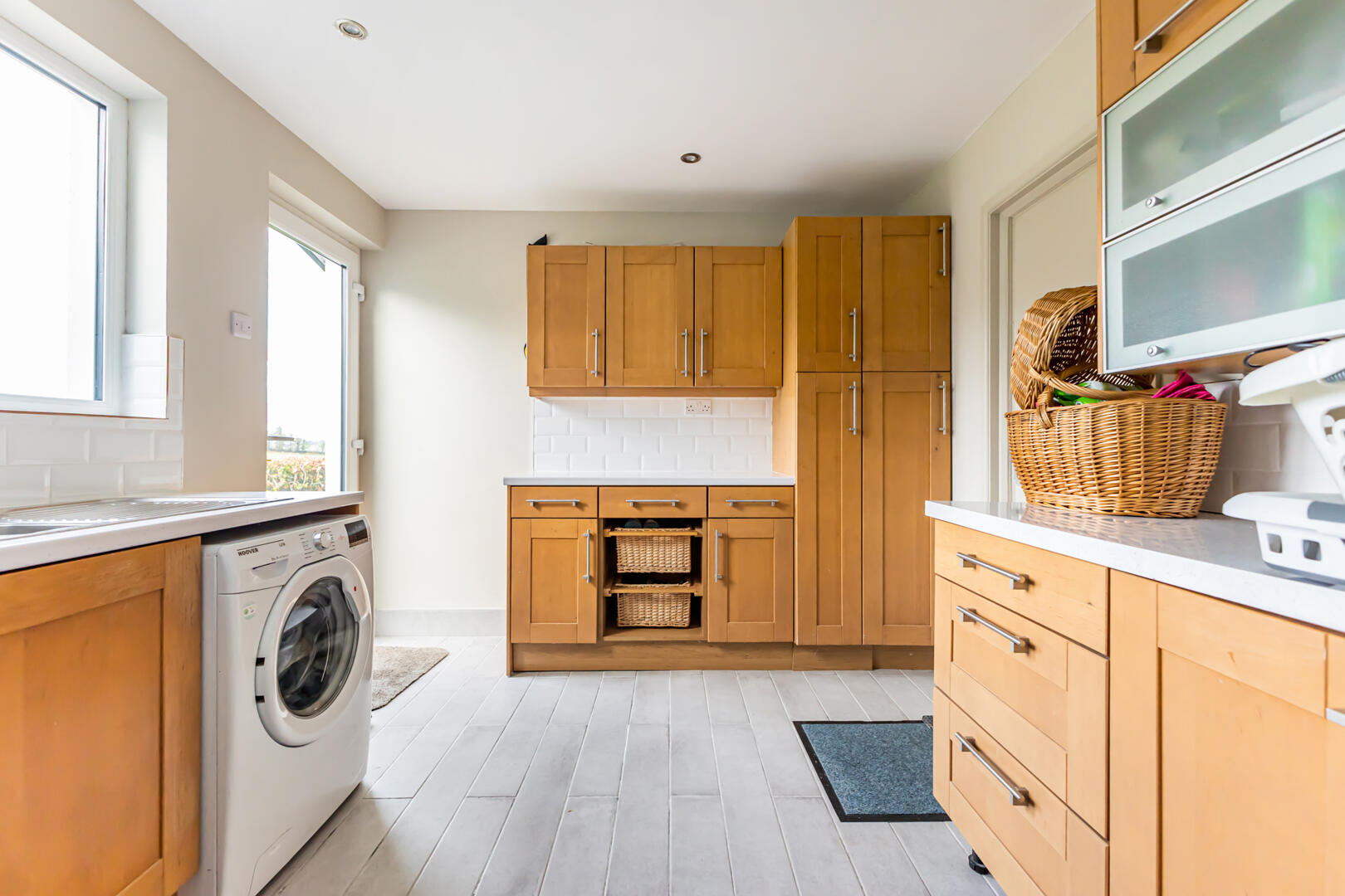 Utility Room - 2.90m x 3.00m (9'6" x 9'10") - porcelain tiled floor, tiled splashback, low and high-level units, laminate wood worktop, stainless steel one-and-a-half sink and drainer, recessed spotlights, plumbing for washer/dryer, UPVC back door with glass inset, access to integral garage with light, power, and automated sectional insulated door