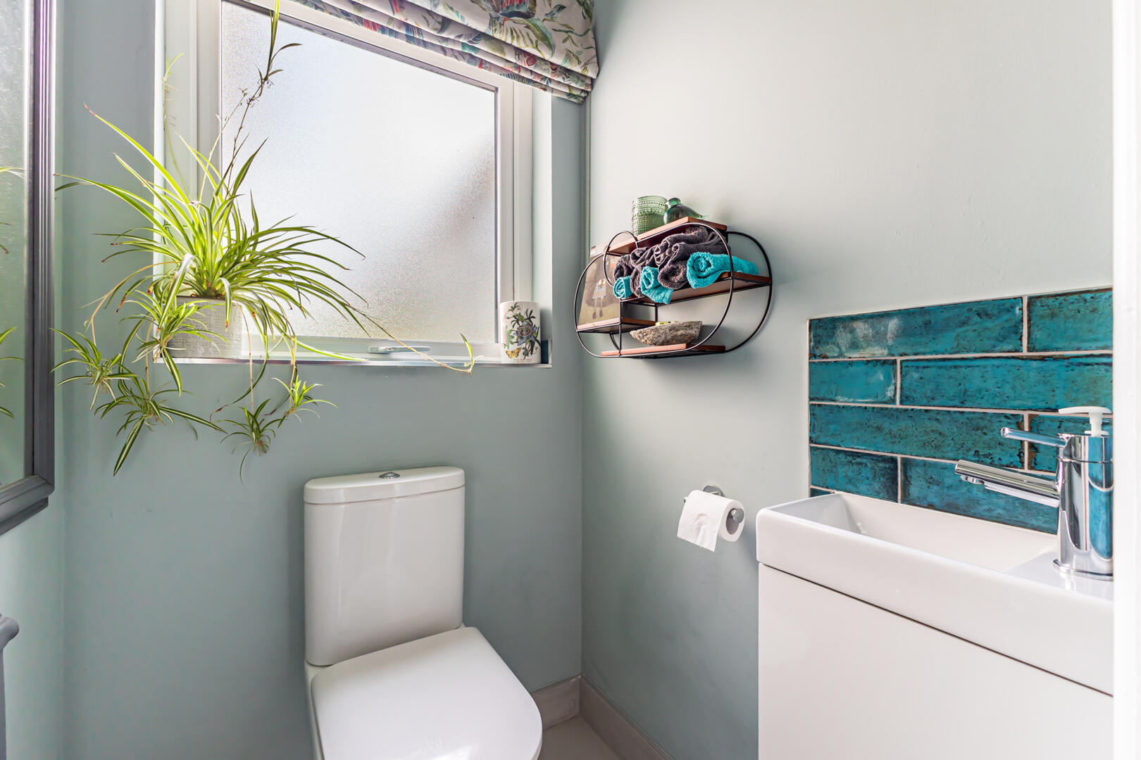 Downstairs Wc - porcelain tiled floor, tiled splashback, low flush WC, vanity unit with chrome mixer tap, outlook to front
