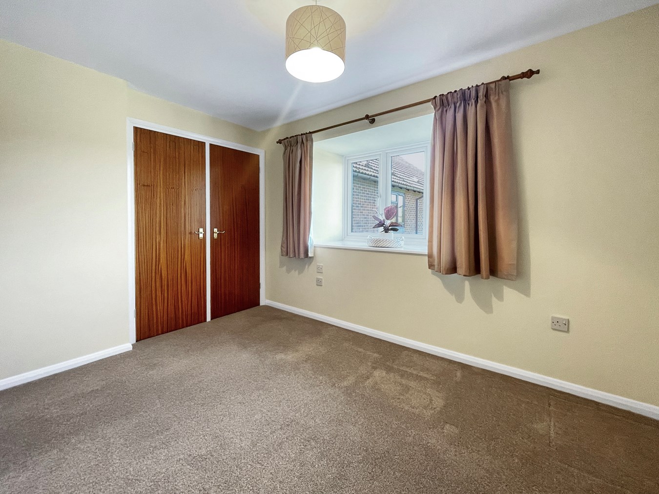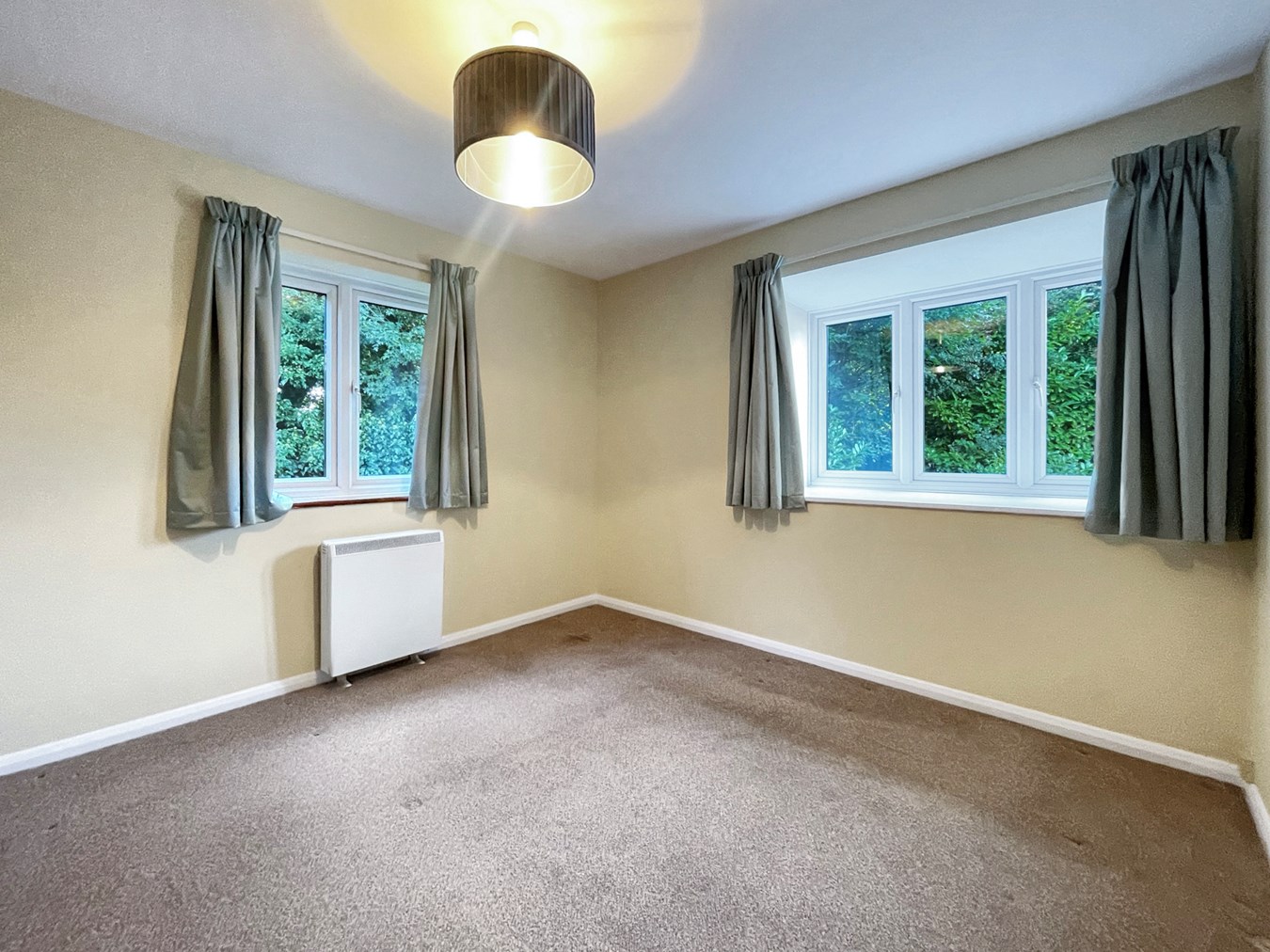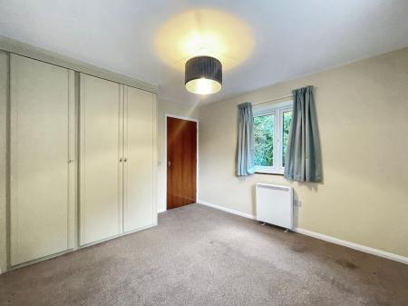 A double bedroom with views to the communal garden via double aspect windows, triple wardrobe cupboards and an electric storage heater.