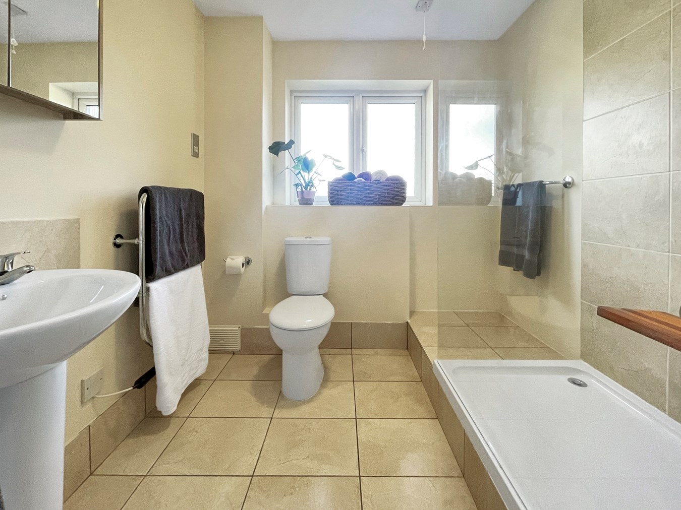 A modern and stylish shower room with a walk in shower unit and Triton power shower, WC, pedestal wash hand basin, a wall mounted mirror cabinet, shaver point, emergency pull cord, tiled walls and stainless steel towel radiator.