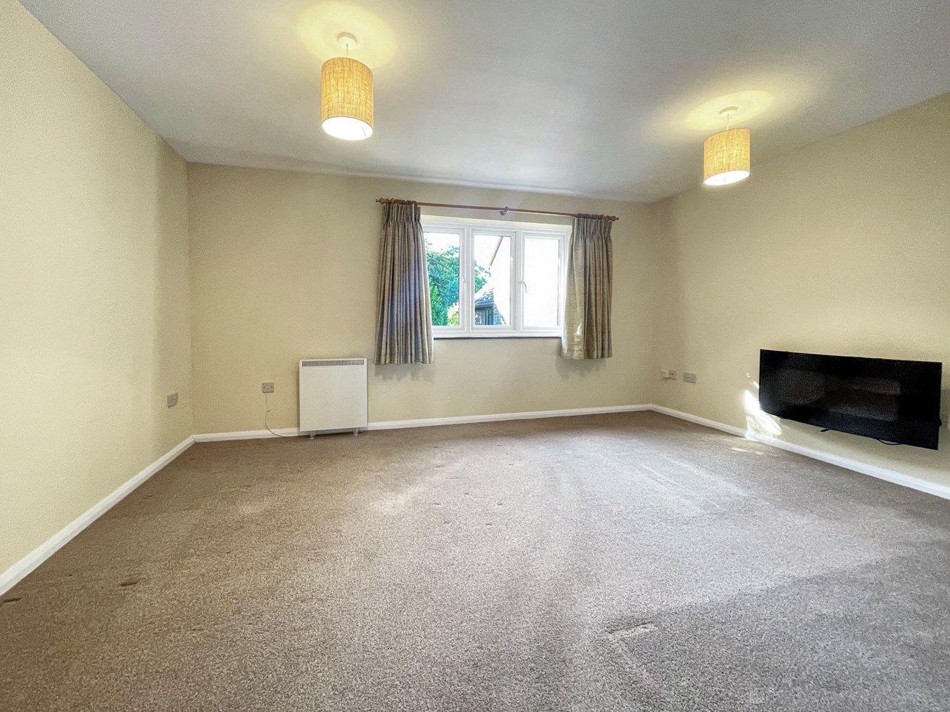 A spacious room for both living and dining with views overlooking the communal garden along with a wall mounted feature electric fireplace and electric storage heater.