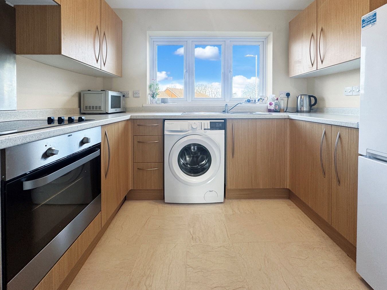 The kitchen is modern with a range of contemporary wall, base and drawer units with laminate work surfaces incorporating a stainless steel sink with mixer tap. Integrated appliances include a Zanussi oven and hob with stainless steel splash back. There is space for a floor standing fridge/freezer and space and plumbing for a washing machine. There is a dimplex wall mounted heater and modern lighting.