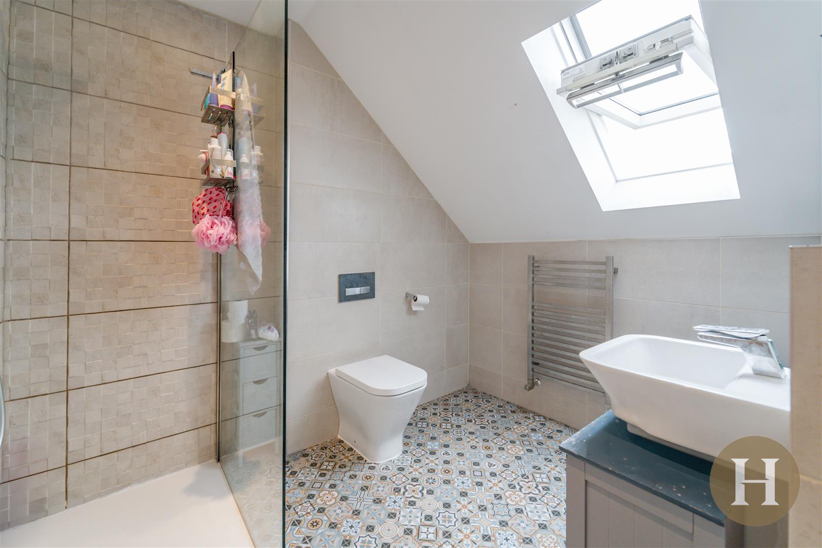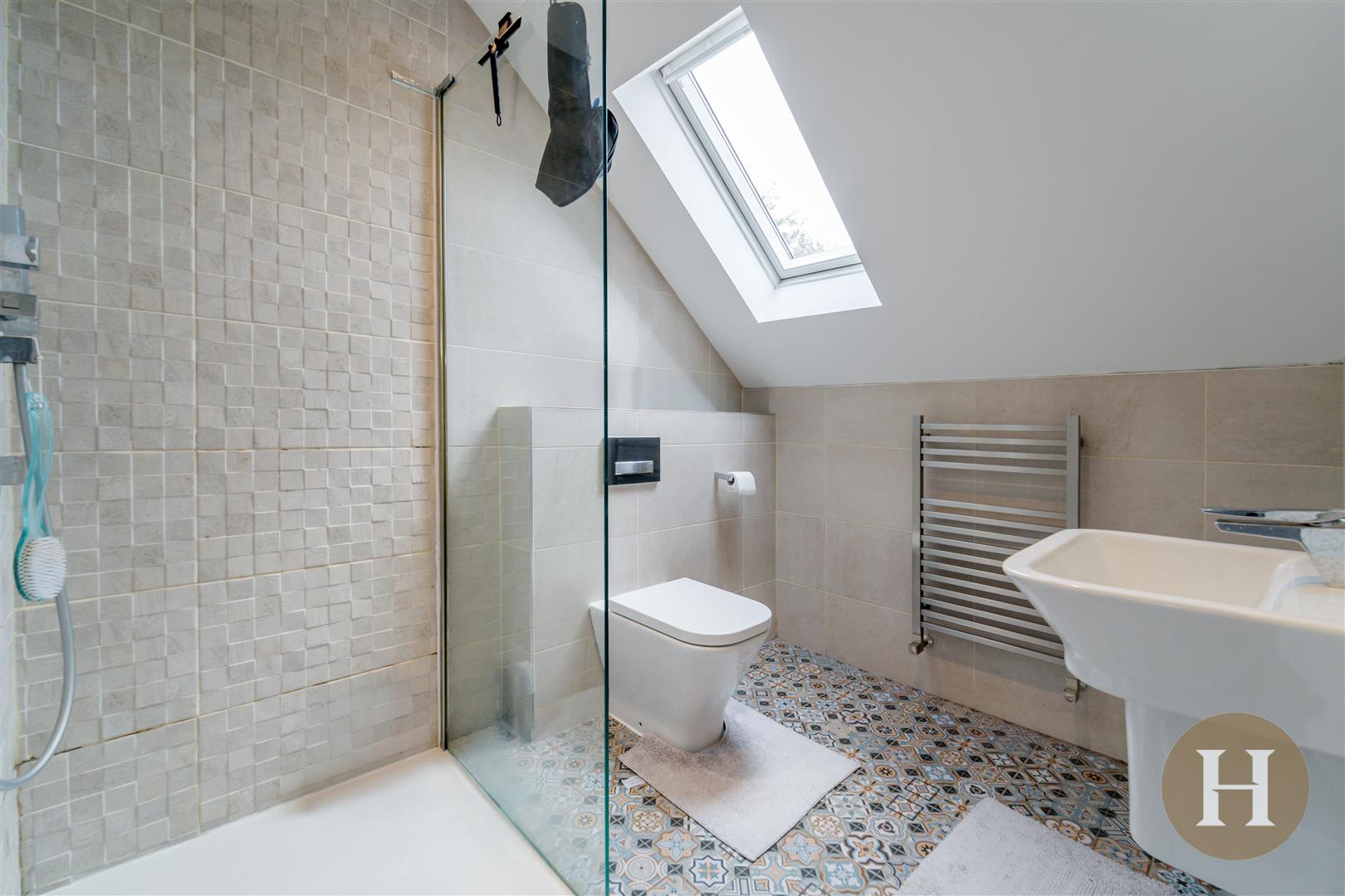 Shower Room - Modern shower room, with walk in mains shower and shower attachment. Concealed low level WC, hand wash basin, partially mirrored wall and towel radiator. Tiled flooring and walls, along with skylight.