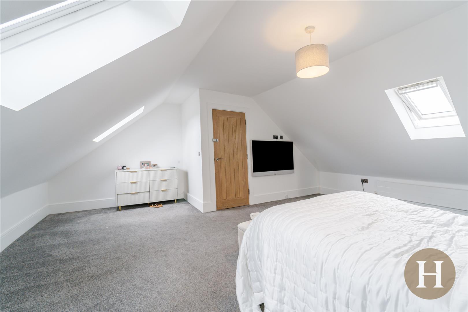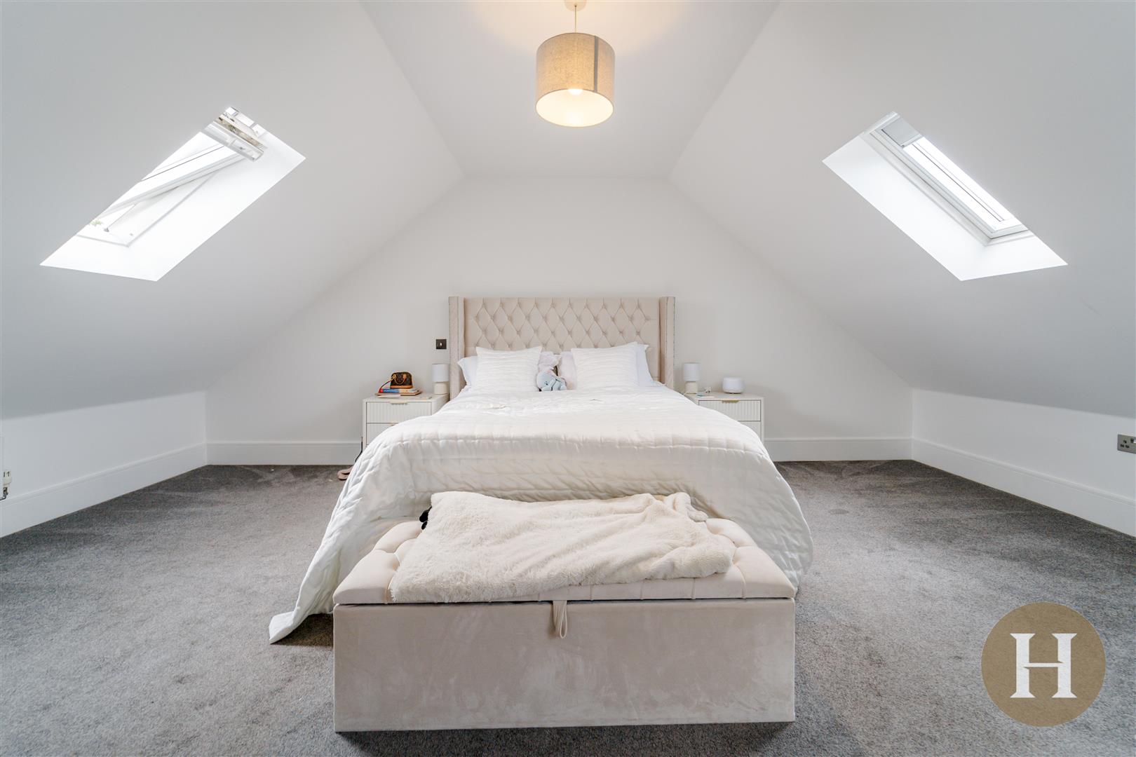 Bedroom Five - Spacious double bedroom with carpeted flooring, skylight and ceiling light point.