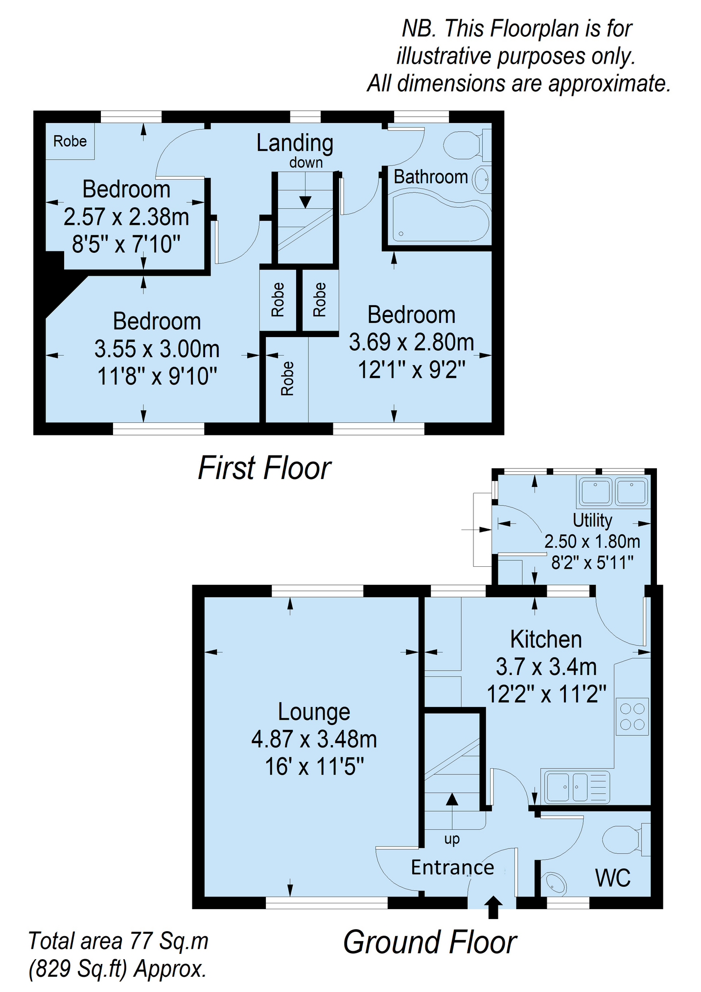 Upstairs are 2 double and 1 single bedroom, all with built-in wardrobes and a well-appointed family bathroom with shower above the bath.