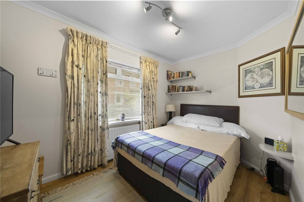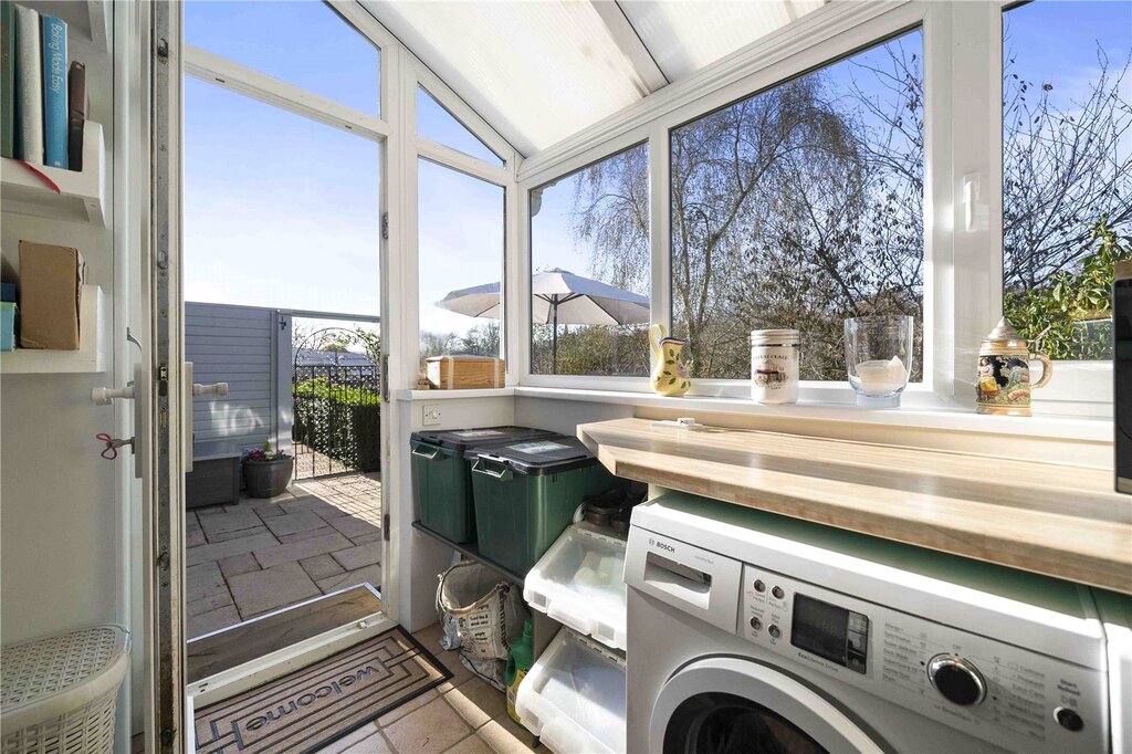 Off the entrance hall are stairs to the first floor, a cloakroom, and a spacious dual aspect lounge with feature fireplace and French doors opening to the patio. There’s a utility room which also gives access to the patio and a well-equipped kitchen with built-in units, integrated appliances and plenty of room for a dining table and chairs.