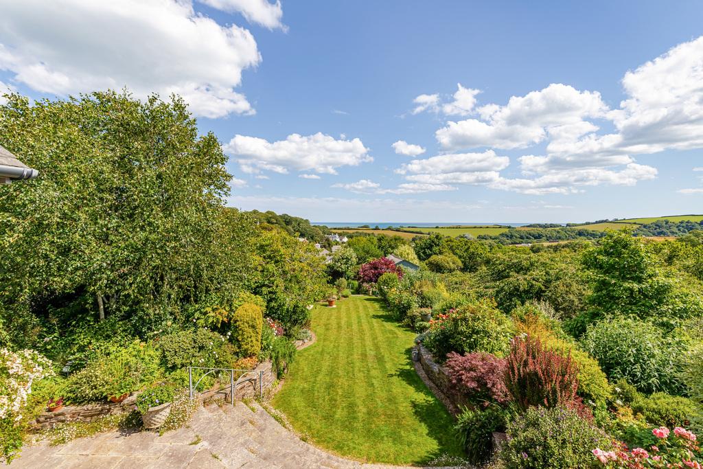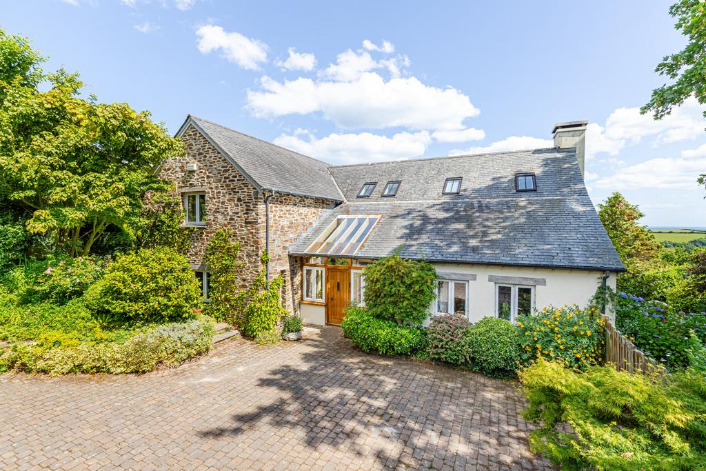 Approached from the lane into the large parking area with double garage you enter the house through a solid oak door into a spacious and light entrance hall, which is full of character. Solid oak doors, hard wood and aluminium double-glazed windows, oak windowsills and a mix of oak and ceramic tiled floors are a theme throughout, along with lovely detailed curved walls and the cantilevered steel staircase is a real feature of the property. From the entrance hall you enter the large sitting room with wood burning stove sitting on a granite hearth with granite mantle. French doors lead out onto the terrace and gardens, and light also floods in from the large windows. Through to the spacious and light kitchen, which also enjoys doors onto the terrace and gardens, is large enough to accommodate a dining table and has a range of fitted units and work surfaces. A wonderful feature in the kitchen is the spacious pantry, with slate shelving and beyond this a large utility and boot room with back door and door down to the plant and large storage rooms, which could make a great gym or cinema room. Also on the ground floor is a cosy dining room for those family suppers, a cloakroom and a spacious and light study. Ascending the cantilevered staircase, you will find a light galleried landing with a large seating area, with floor to ceiling windows, allowing you to enjoy the spectacular views over the gardens, village and sea beyond. This is a special place to enjoy your favourite book or morning coffee. A master bedroom with ensuite shower room, guest bedroom with ensuite and walk in dressing room, two further double bedrooms and family bathroom complete the first floor. There is also a useful airing cupboard off the landing and various cupboards and fitted wardrobes add useful storage.