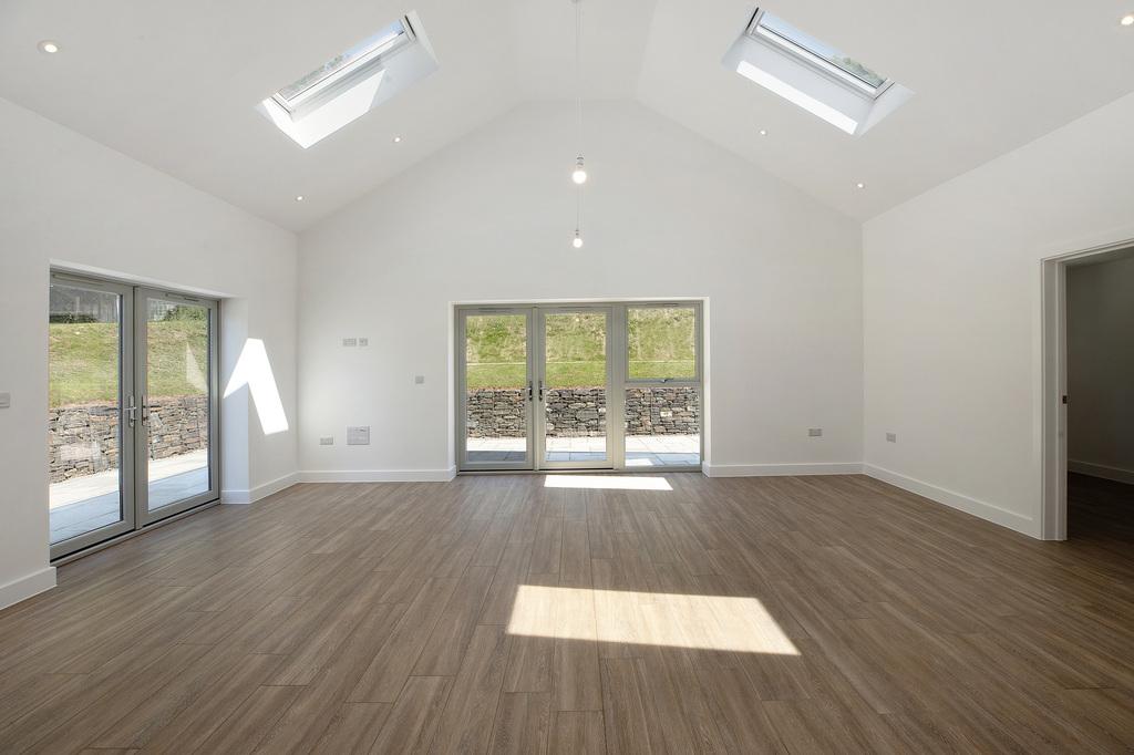 - Open plan kitchen/dining/living room with vaulted ceiling, skylights, 2 sets of French doors