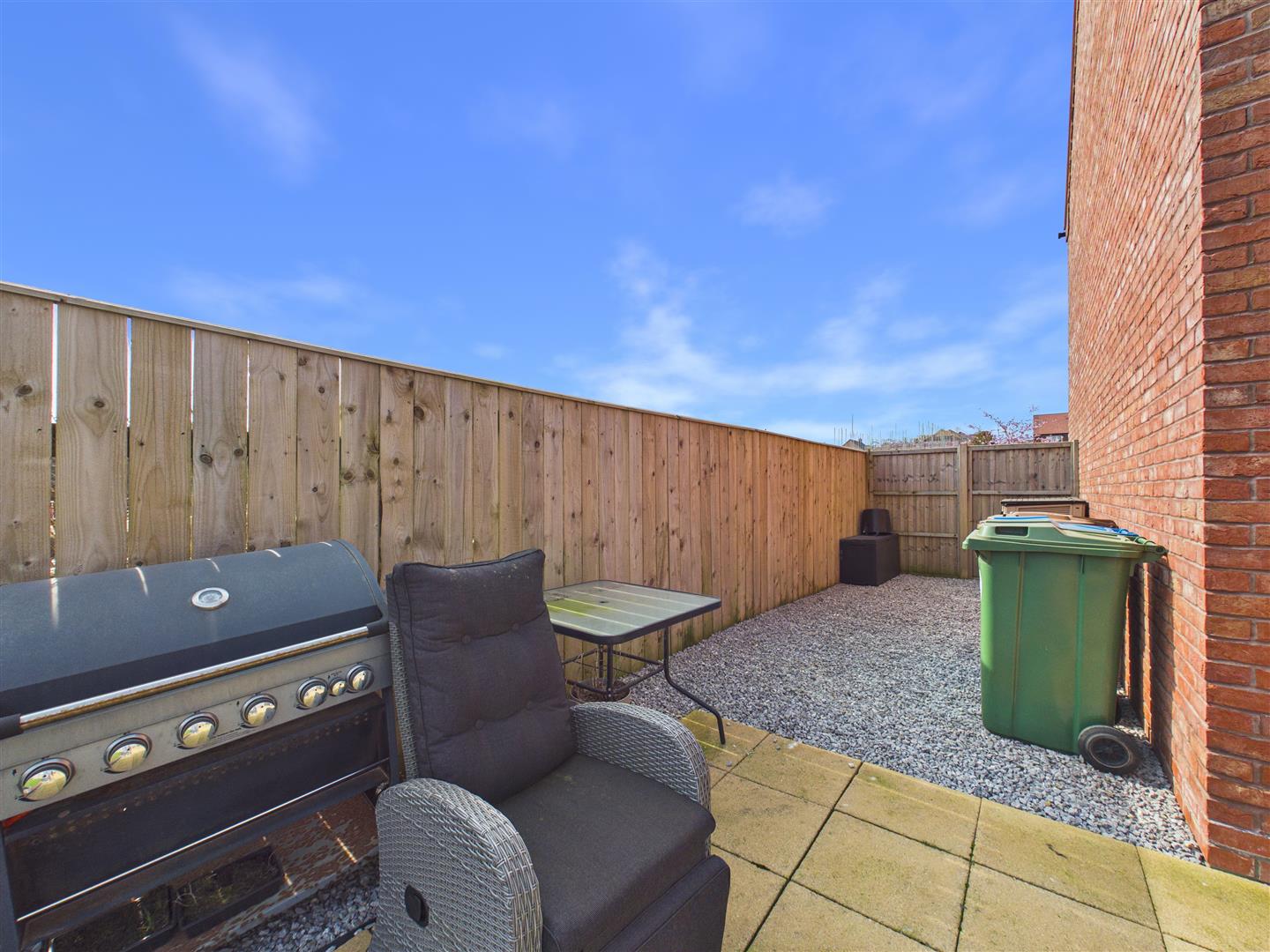 To the rear, the garden is thoughtfully designed across two levels. An extensive patio area directly adjoins the house, providing an ideal space for outdoor entertaining, with steps leading down to a further lawned garden beyond. Additionally, a gravelled area to the side offers a practical space for bin storage and further outdoor requirements.