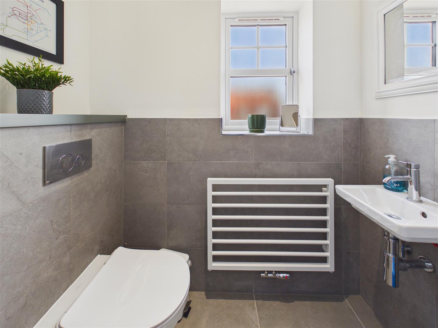 Cloaks/W.C. - With low flush W.C. and wash hand basin. Heated towel rail, part tiling to walls, tiled floor and window to rear.