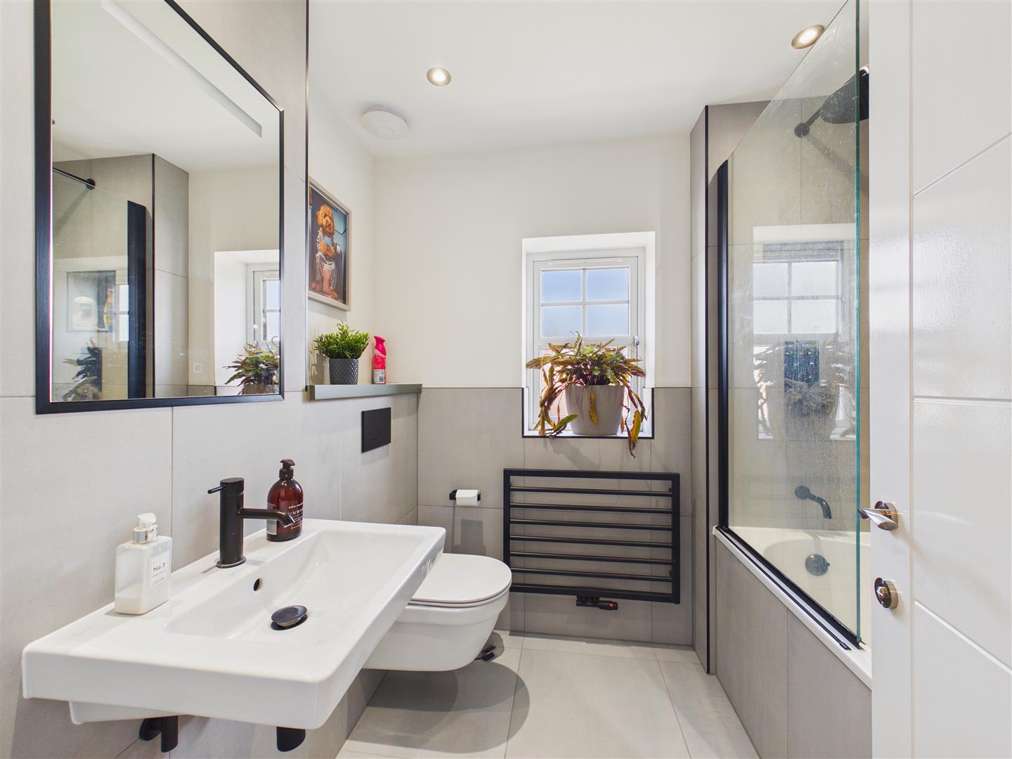 Bathroom - With suite comprising a bath with shower over and screen, wash hand basin and low flush W.C. Stylish black accessories including taps and shower head. Part tiling to walls, tiled floor, heated towel rail and window to rear.