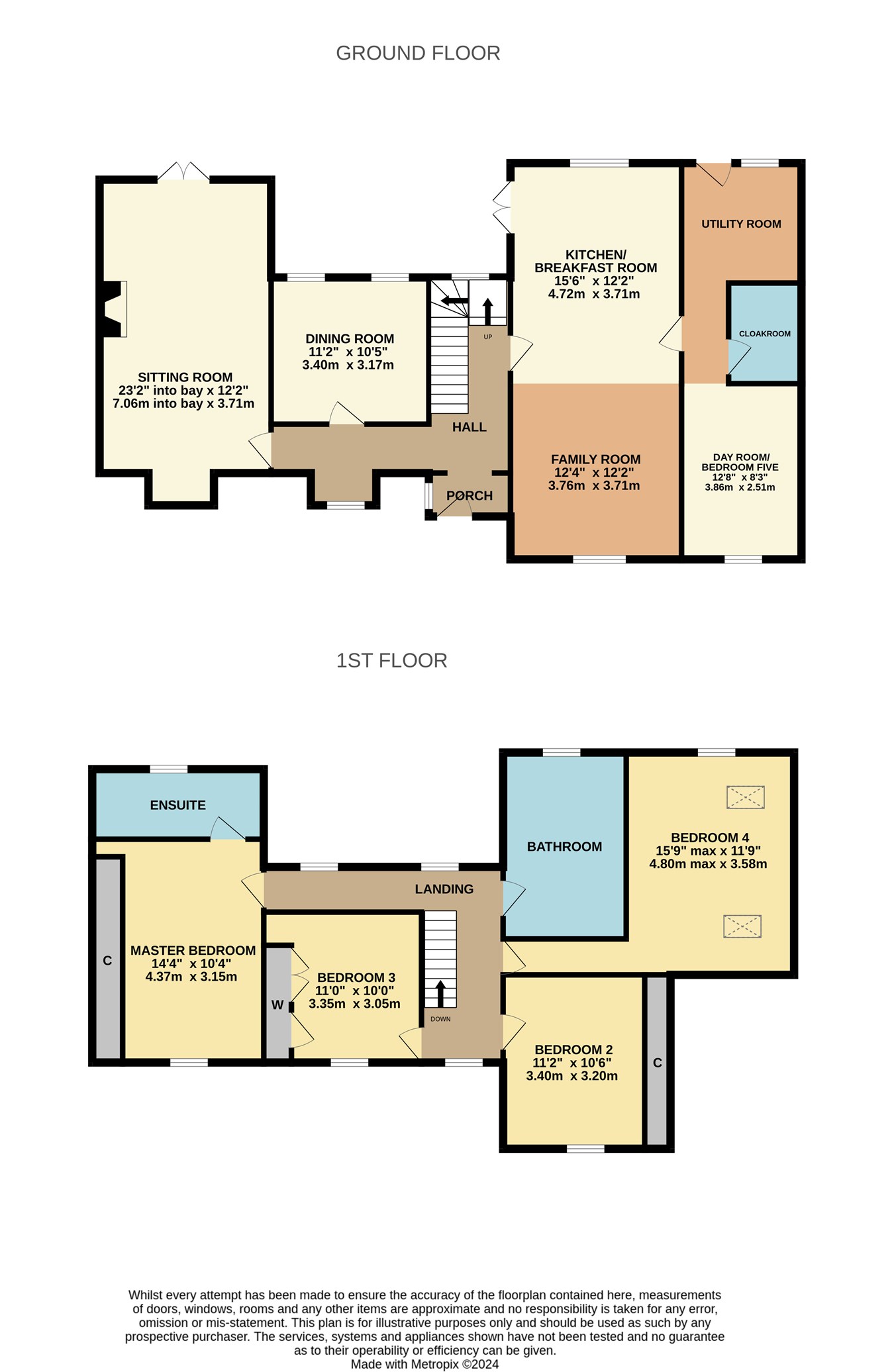Upstairs there is a master bedroom with built in wardrobes and ensuite shower room. The further three bedrooms are all double rooms and there is a large family bathroom.