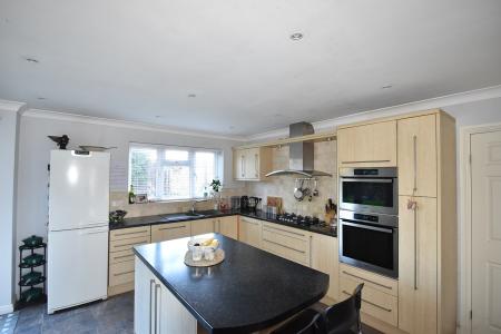 15' 6" x 12' 2" (4.72m x 3.71m) Double glazed window to rear. Double glazed doors onto the patio. Range of base and wall units. Grey one and a half bowl sink unit. Whirlpool electric oven and Whirlpool oven/microwave. Hotpoint five ring gas hob with extractor hood over. Integrated dishwasher. Space for fridge/freezer. Radiator with decorative cover. Tiled floor. Downlighting.