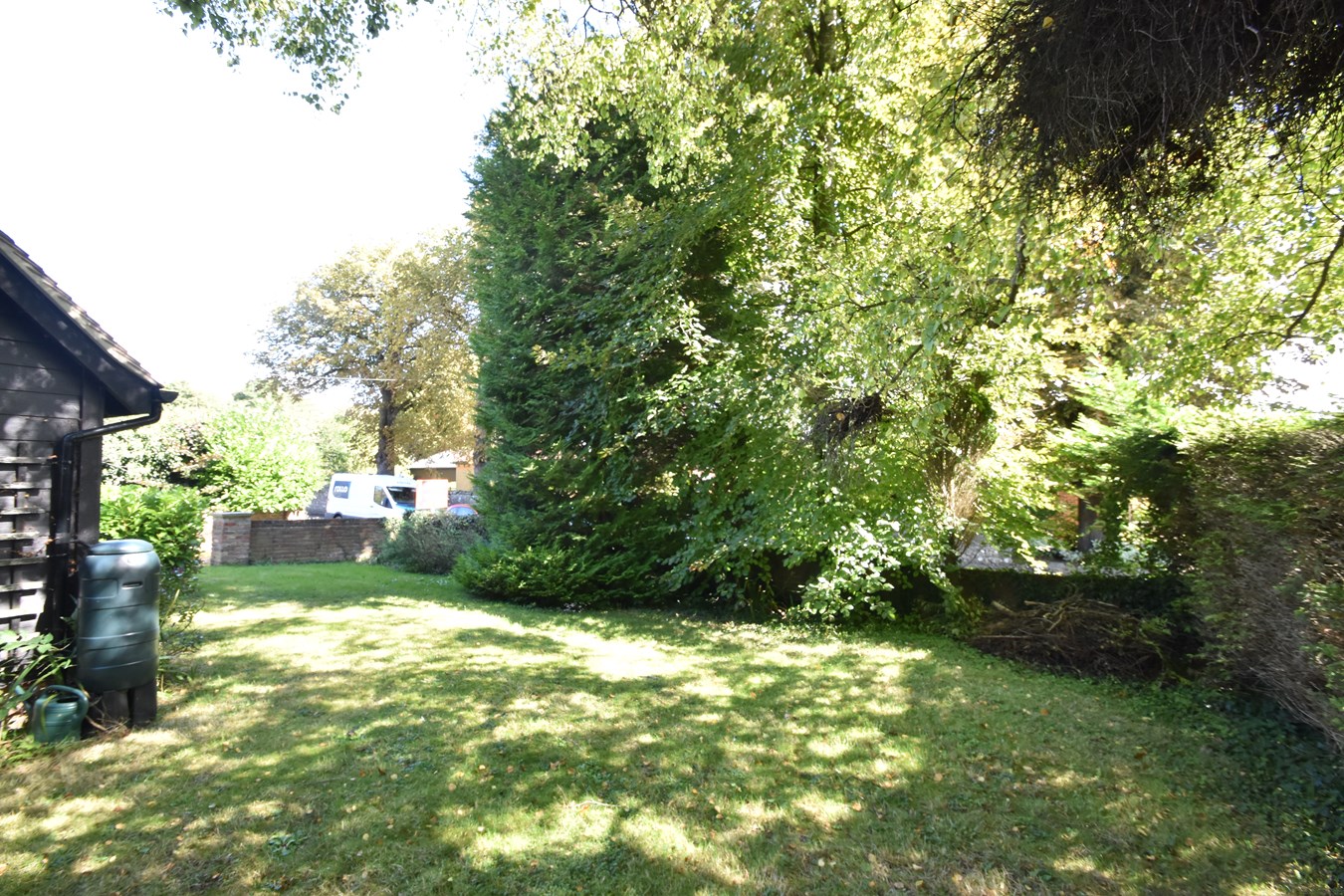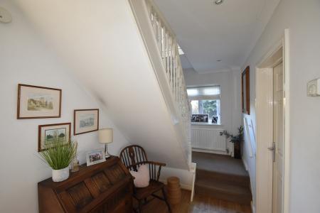 Extensive front garden measuring 75ft x 70ft. Brick wall and long shingled dirveway. Laid to lawn with mature shrubs and trees. Log store.