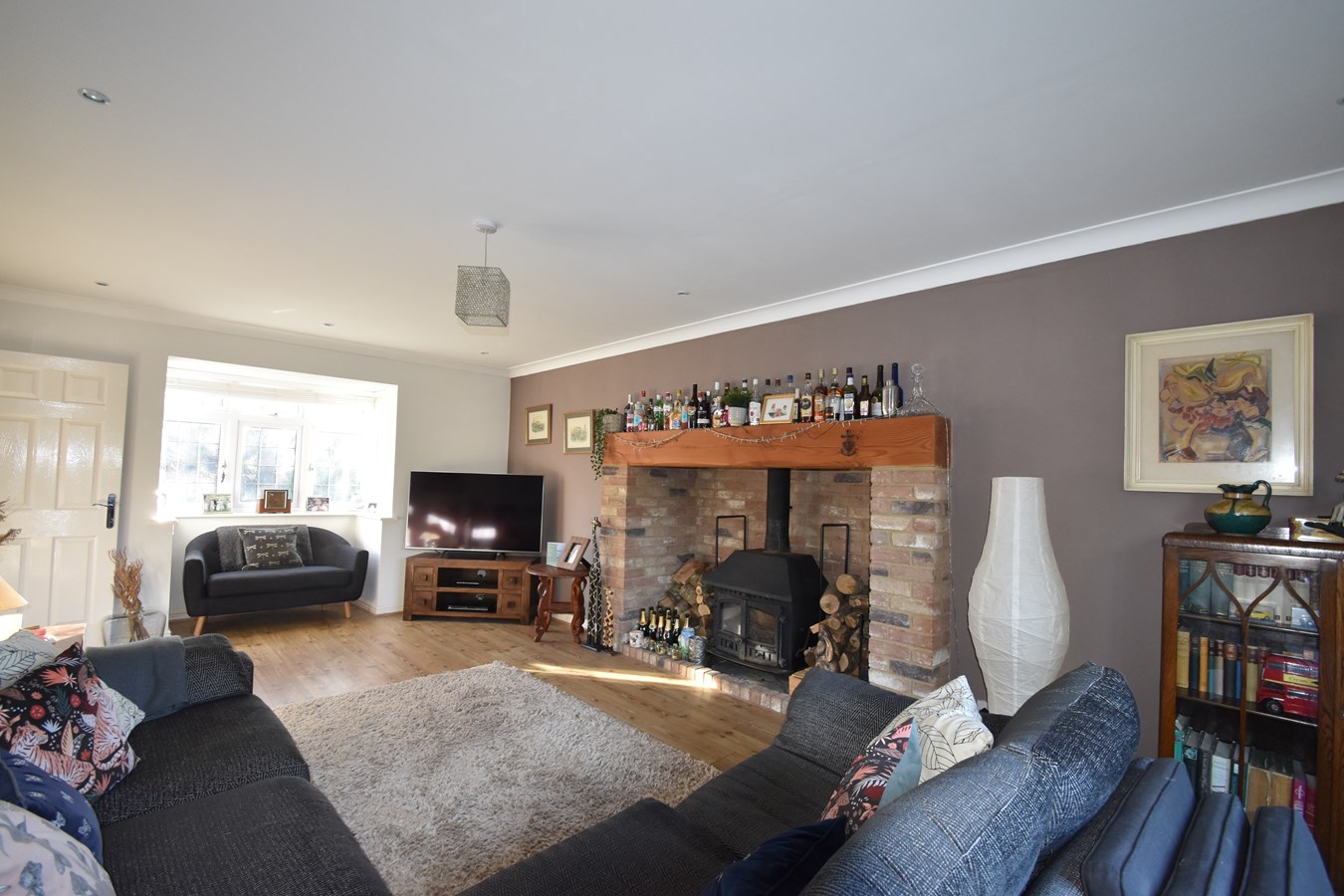 23' 2" into square bay x 12' 2" (7.06m x 3.71m) Double glazed square bay to front. Double glazed doors to rear garden. Imposing feature brick fireplace with log burning store. Radiator with decorative cover. Laminate flooring. Downlighting.